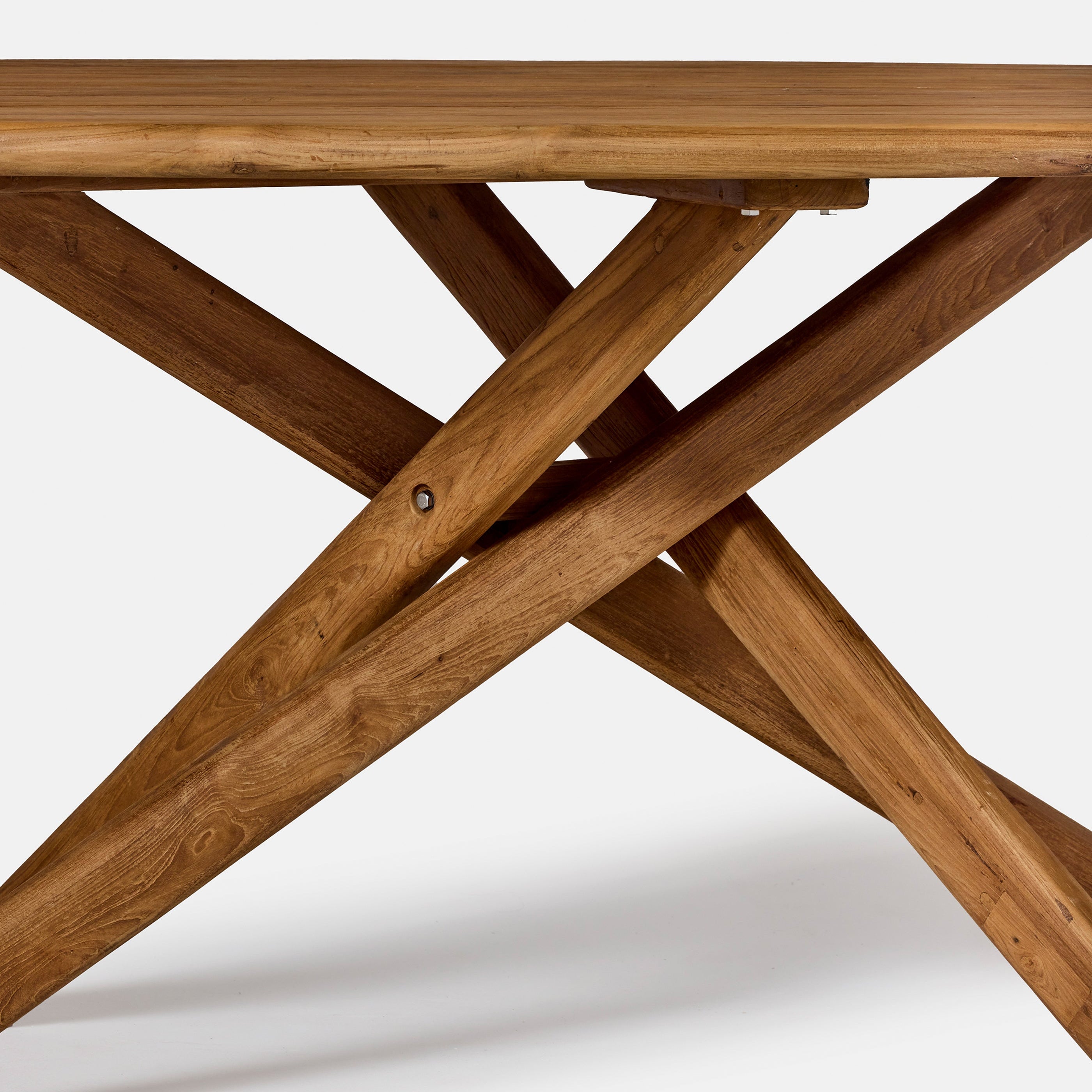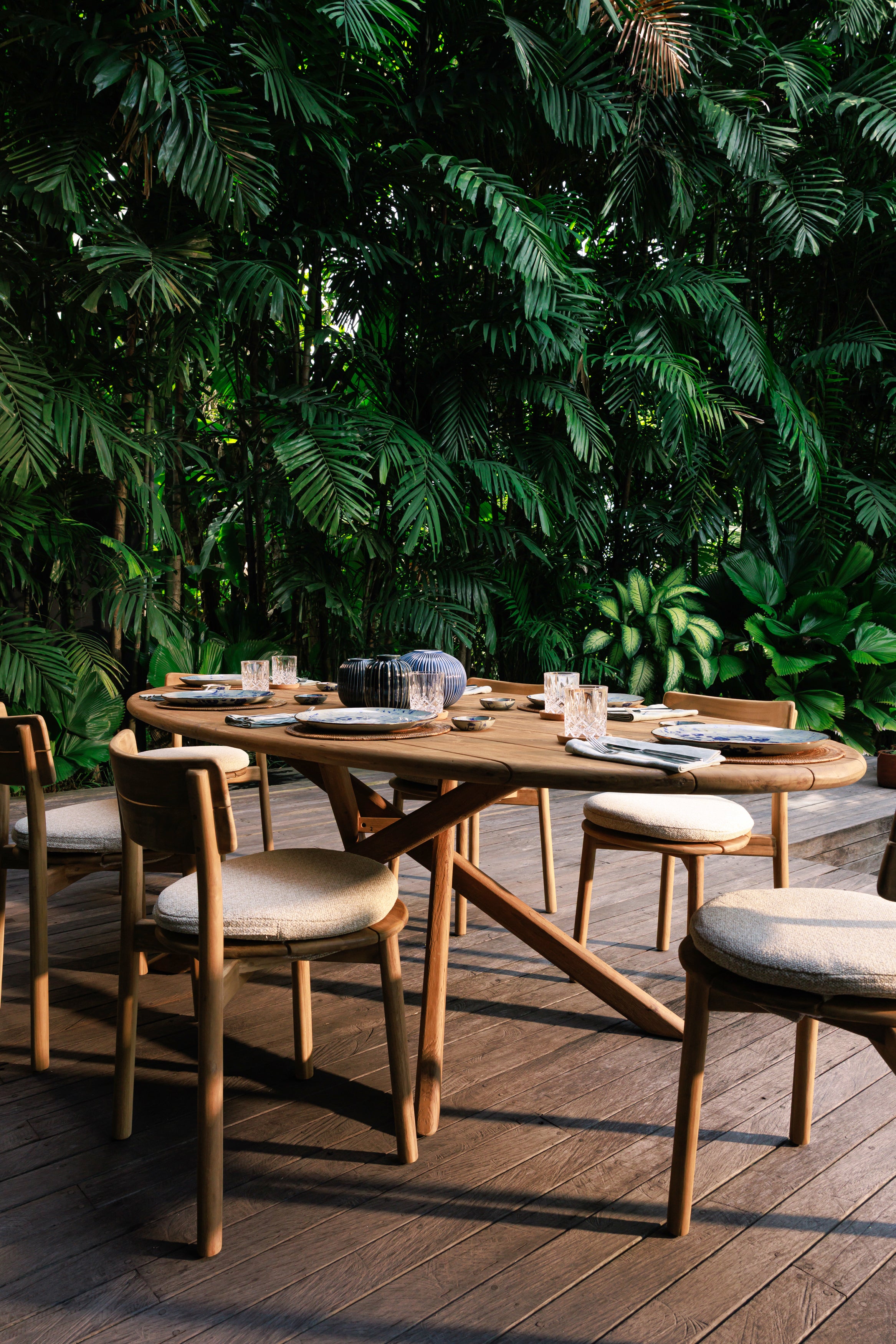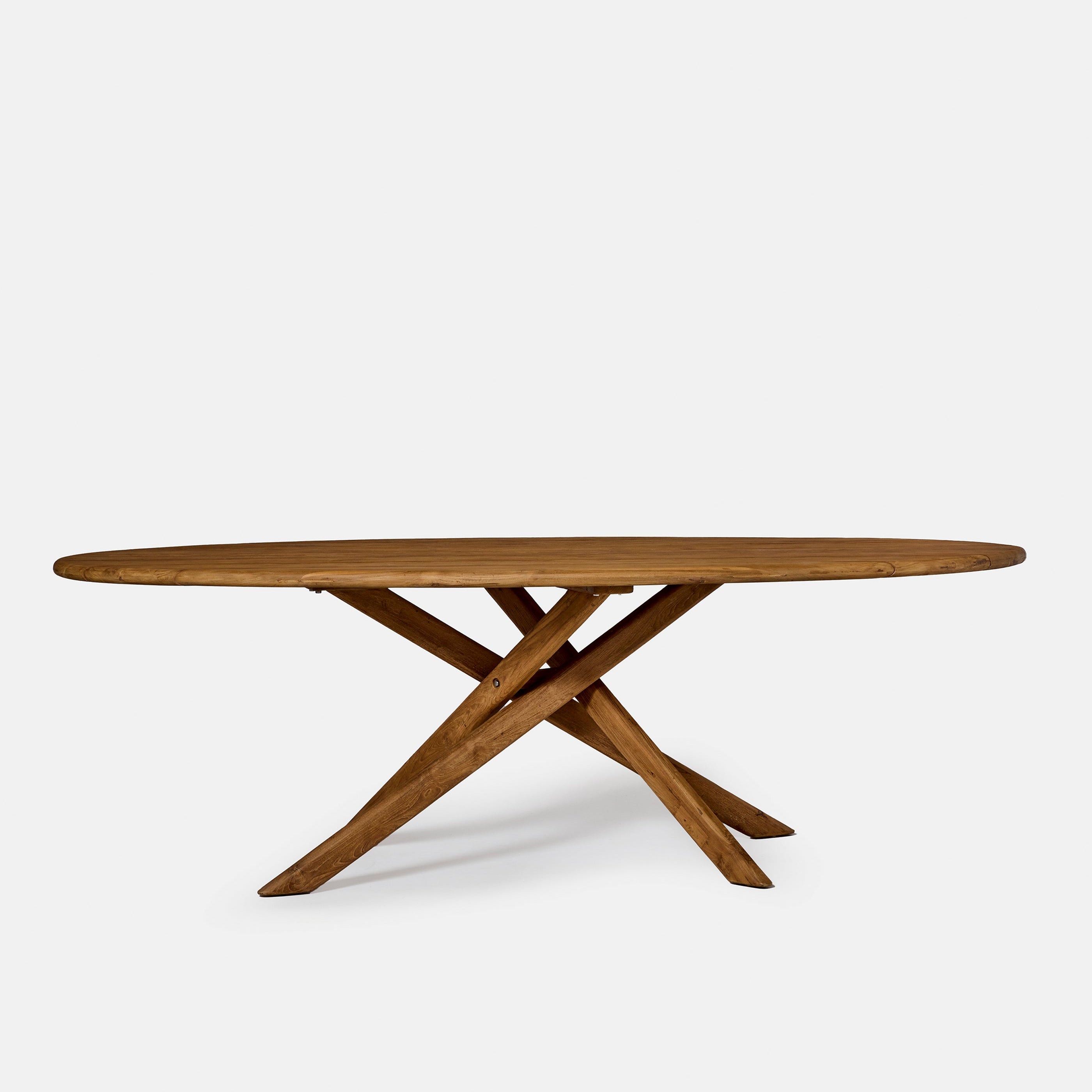 Table extérieure en teck massif recyclé, la table Sisa associe robustesse, design architectural et matière naturelle. Son plateau ovale et sa structure croisée offrent stabilité et élégance pour accueillir les repas en extérieur avec durabilité et style.