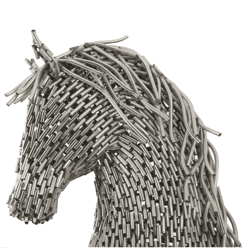 Au bord d'une piscine, dans un jardin structuré ou sur une terrasse contemporaine, cette sculpture de cheval impose une ligne dynamique et graphique. Sa construction en cylindres d'acier inoxydable compose un jeu de volumes net, à la fois rigoureux et vivant, qui change selon l'angle de vue et les reflets de son fini brillant effet miroir. Réalisée à la main, chaque pièce présente un assemblage singulier qui renforce son caractère artisanal sans perdre la précision de son dessin. L'inox lui permet de s'installer aussi bien en intérieur qu'en extérieur, y compris dans des environnements exposés à l'humidité et aux intempéries. Cette statue ne se limite pas à un rôle décoratif, elle crée un point de repère visuel dans l'espace et accompagne aussi bien une architecture épurée qu'un aménagement paysager plus minéral. Le motif du cheval, traité ici dans une écriture contemporaine, apporte du mouvement sans alourdir l'ensemble et donne à la composition une allure affirmée, lisible, durable.