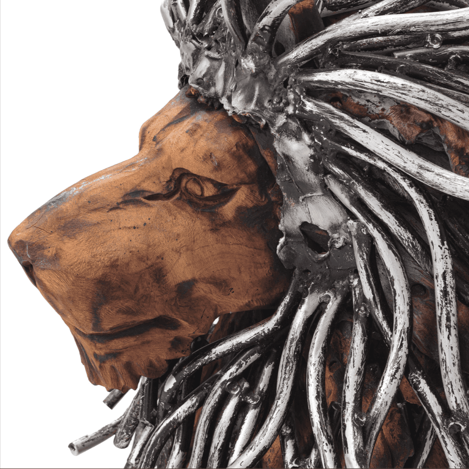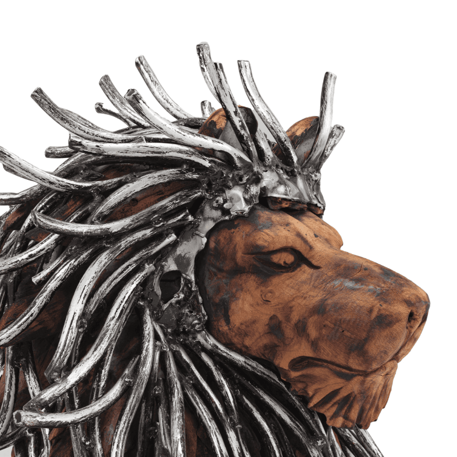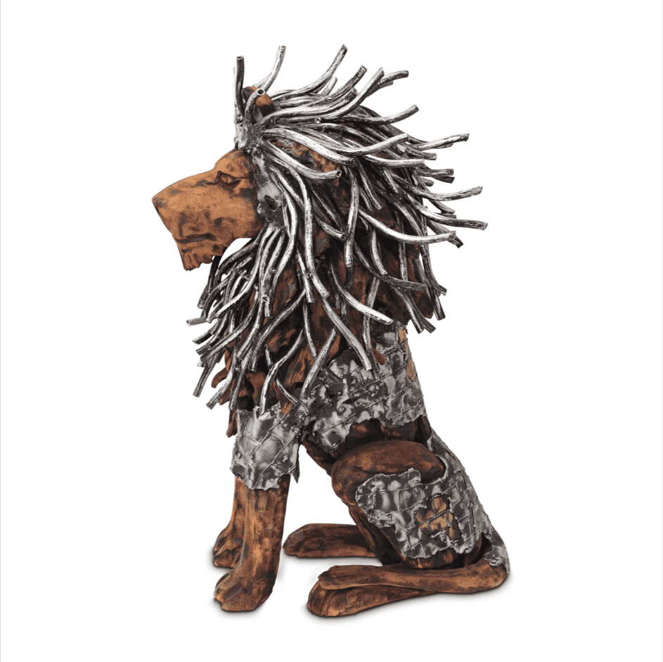 Statue lion assis en bois avec cheveux en aluminium