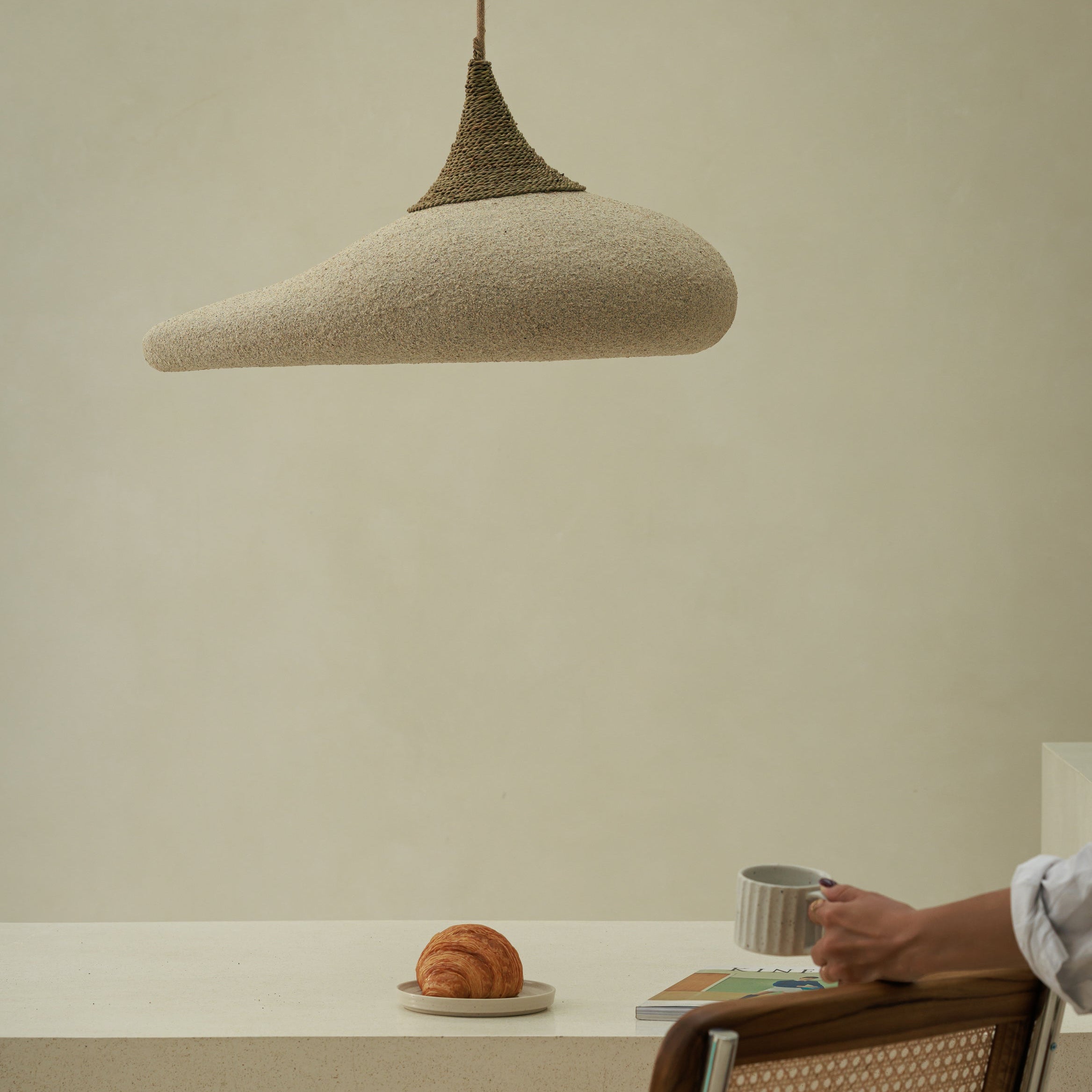 Dans un intérieur épuré, la suspension Ajan attire le regard par son dessin organique et sa surface texturée, presque minérale. Façonnée à la main à Bali, elle associe la résine à une projection de sable qui accentue son relief et lui donne un aspect mat, nuancé, très décoratif même éteinte. Une fois allumée, elle diffuse un éclairage doux qui adoucit l’atmosphère sans alourdir l’espace, ce qui en fait une pièce adaptée au salon, à la chambre, à la salle à manger ou à un coin lecture. Son profil fluide s’intègre facilement dans des décors contemporains, naturels ou wabi-sabi, où la matière occupe une place centrale sans effet démonstratif. Installée seule au-dessus d’une table ou en point d’éclairage dans une pièce de vie, elle compose un ensemble sobre et travaillé, avec cette irrégularité légère propre aux objets réalisés artisanalement. Chaque pièce présente ainsi de subtiles variations de texture. Vendue sans système électrique, elle permet de choisir une installation en accord avec le projet et le rendu recherché.