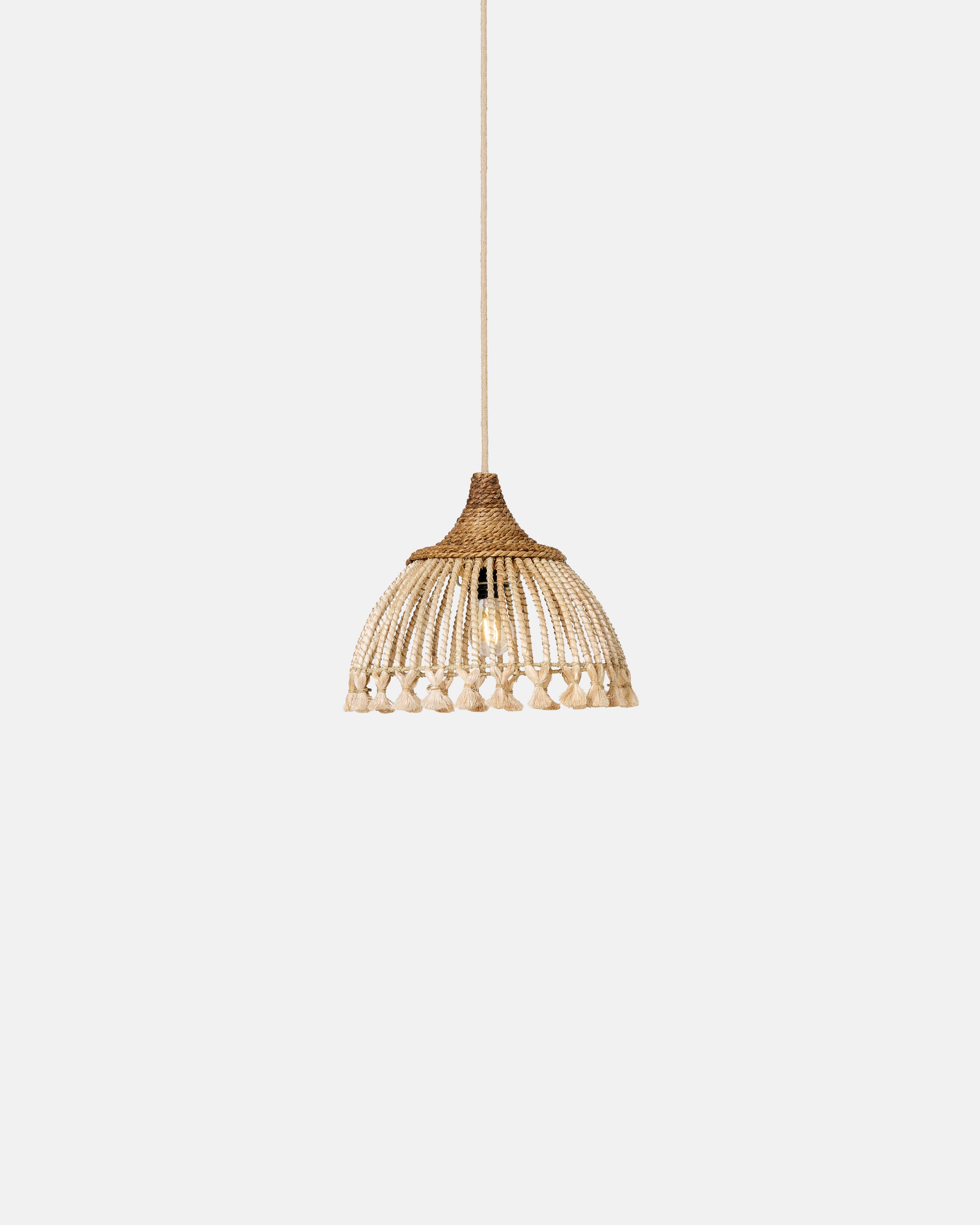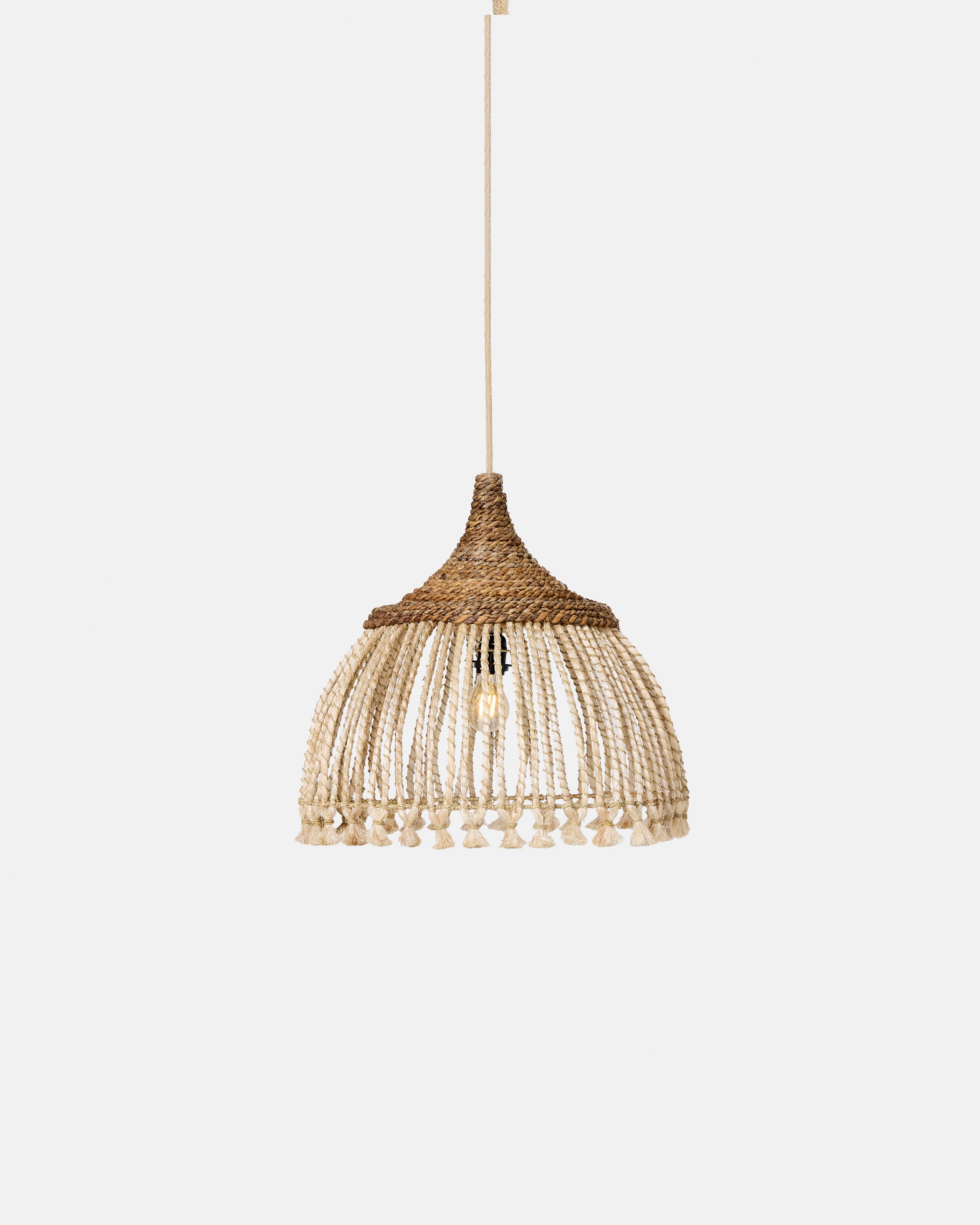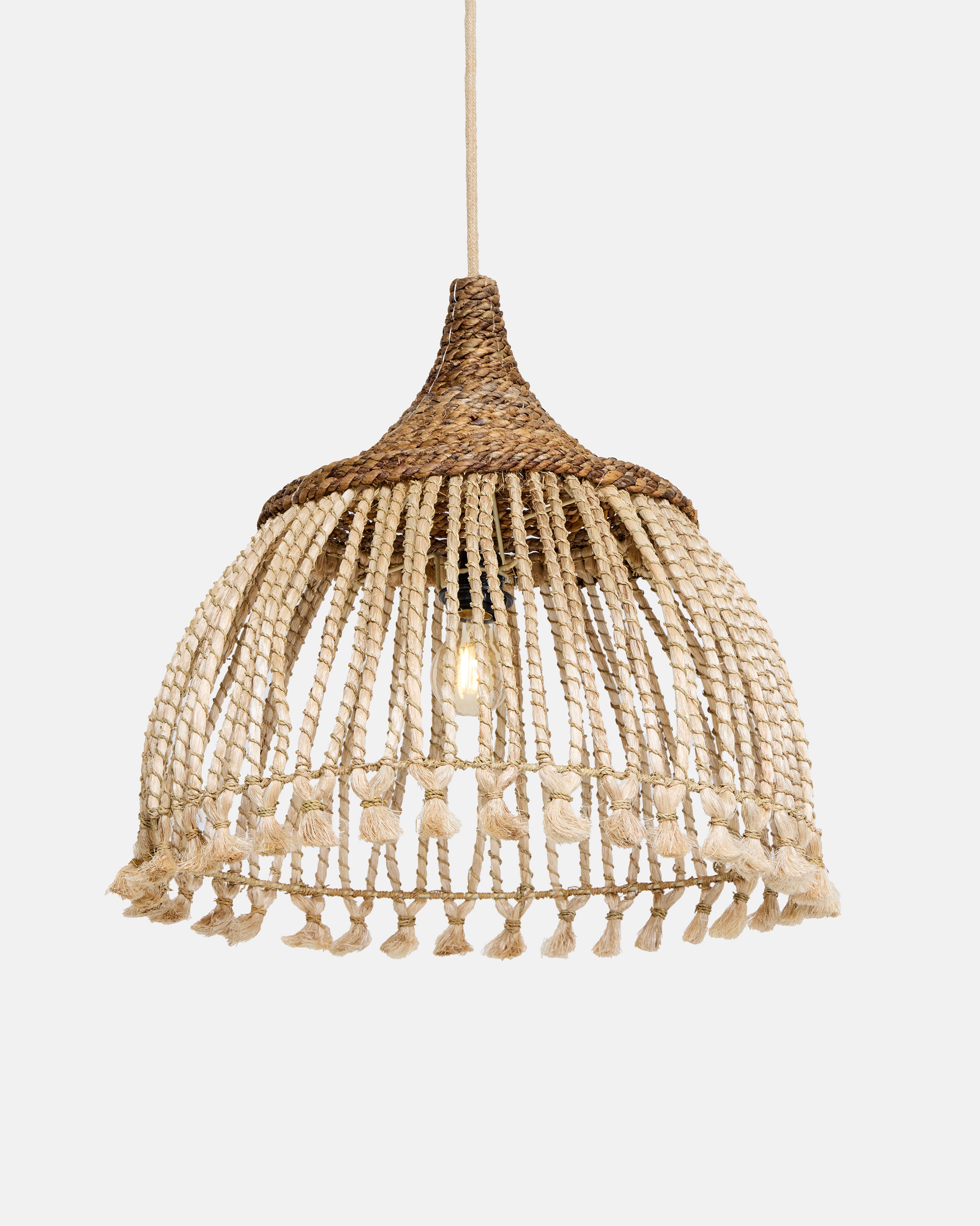Suspension Andaru en fibre naturelle tressée avec pompons décoratifs, ce luminaire bohème diffuse une lumière douce et chaleureuse tout en apportant une texture artisanale et aérienne à un intérieur naturel, ethnique chic ou contemporain.