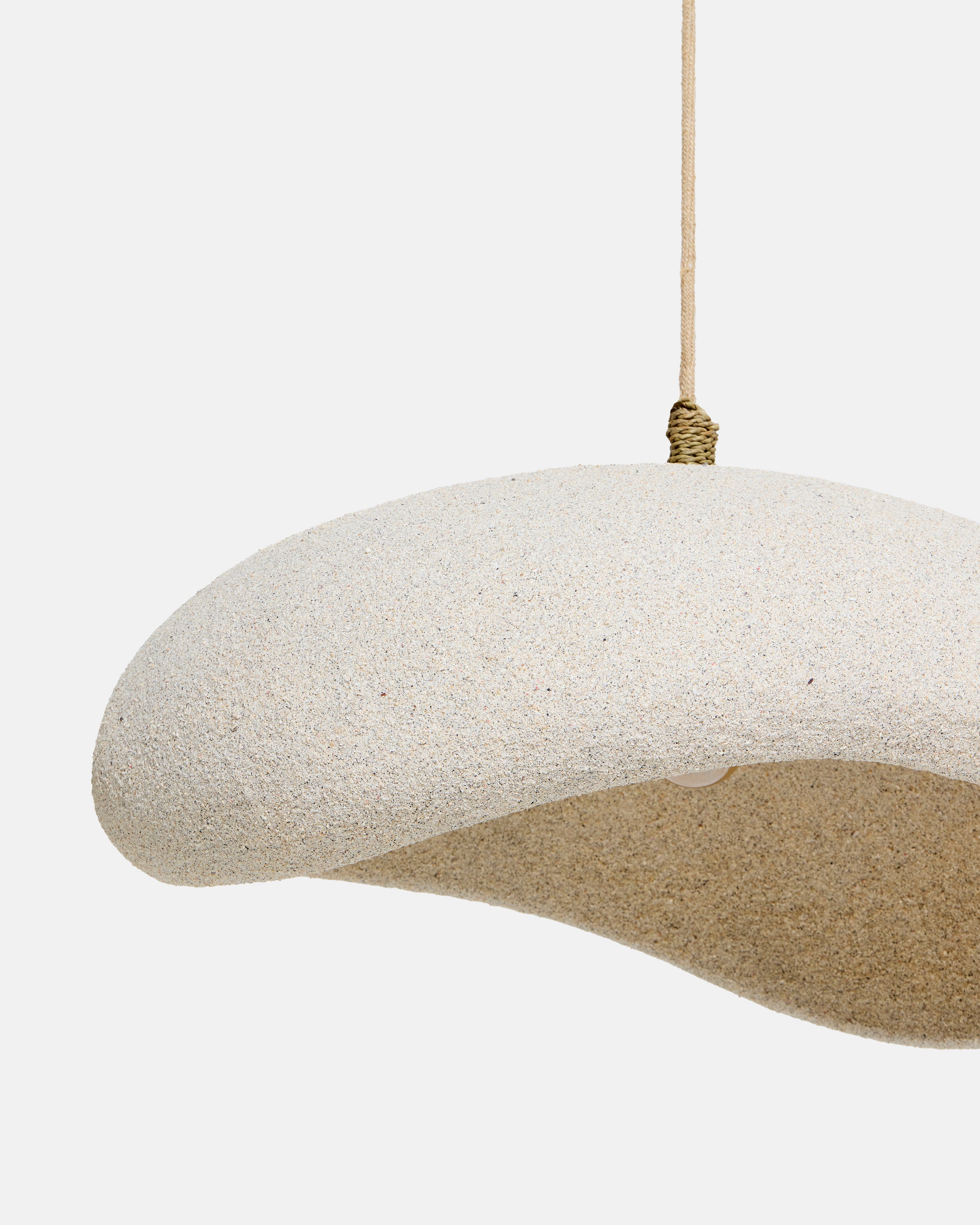 Suspension Malasso en sable et résine faite main à Bali, texture minérale organique et forme sculpturale, luminaire décoratif idéal pour un intérieur bohème, contemporain organique ou wabi-sabi, livrée sans système électrique.