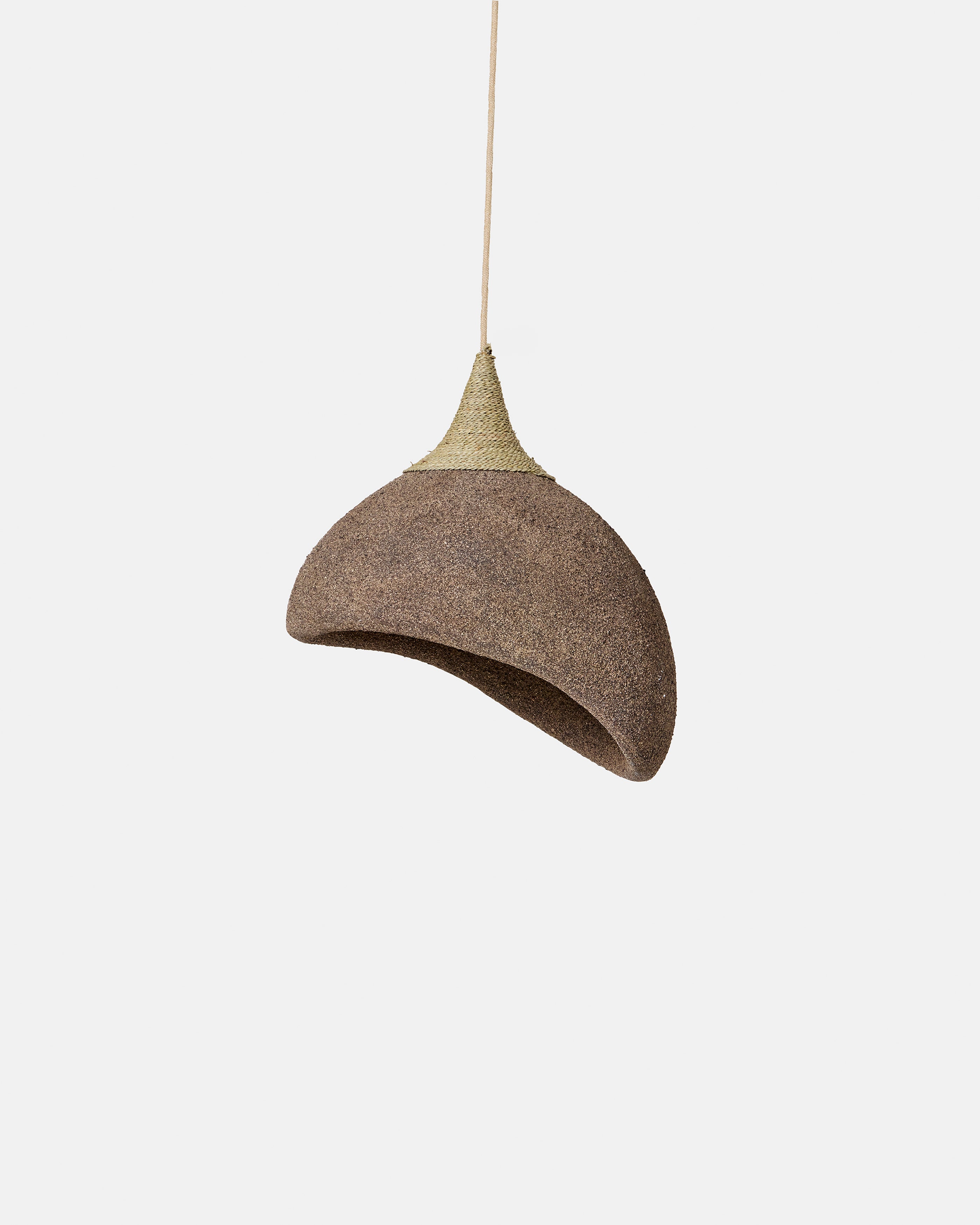 La suspension Miring en finition marron installe dans l’espace une atmosphère feutrée, presque minérale, comme une présence façonnée par le temps et la matière. Sa teinte profonde rappelle la terre chaude, les sols patinés par le soleil, et donne immédiatement à la lumière une dimension plus enveloppante, plus intime.