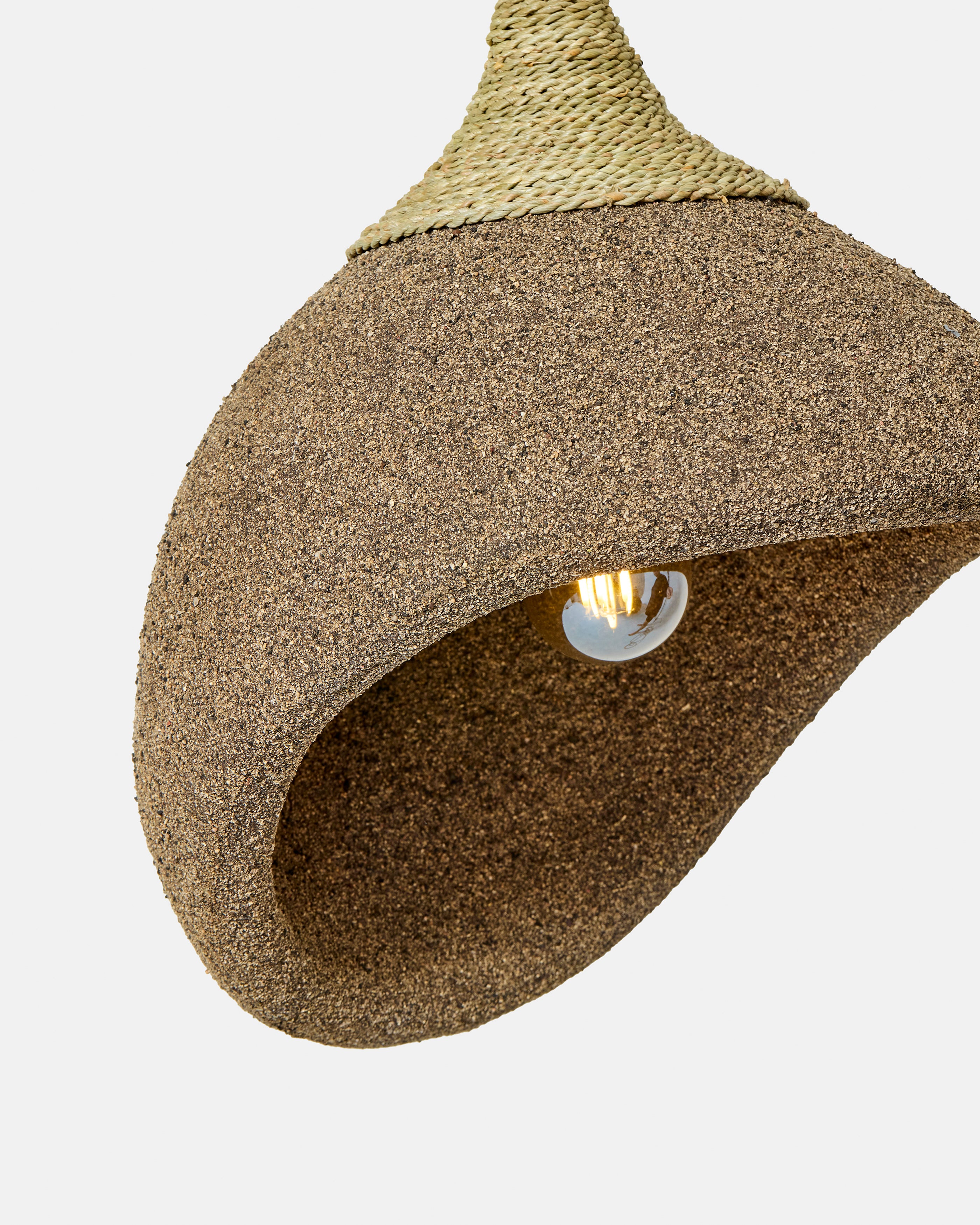 Façonnée à la main à Bali, chaque Miring révèle une texture singulière née de la projection de sable et de résine. La surface légèrement granuleuse capte la lumière avec douceur, crée des nuances subtiles et transforme l’éclairage en une expérience visuelle apaisante. Sa forme organique, libre et sculpturale, apporte à l’intérieur cette sensation rare d’objet à la fois décoratif et architectural, comme posé là naturellement.