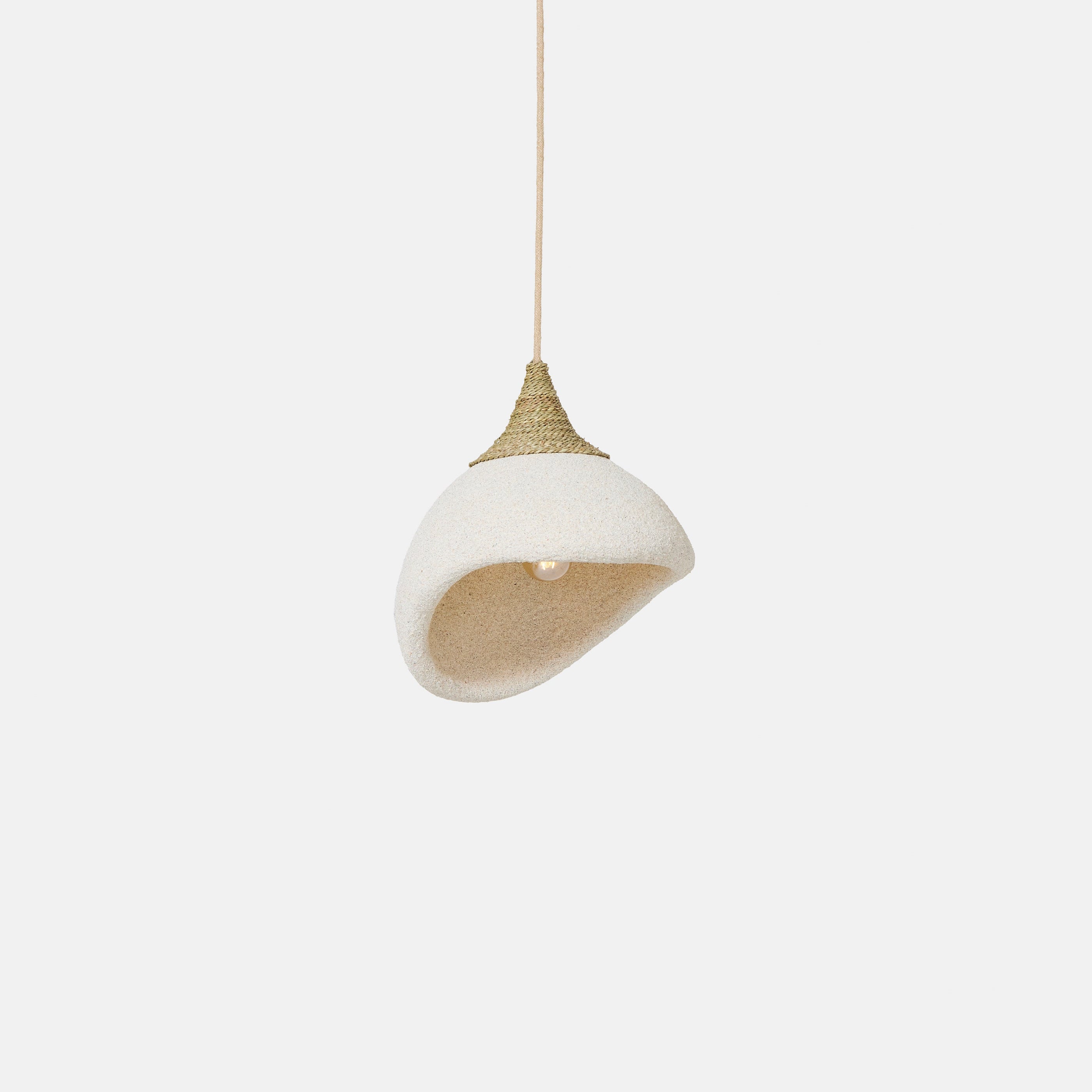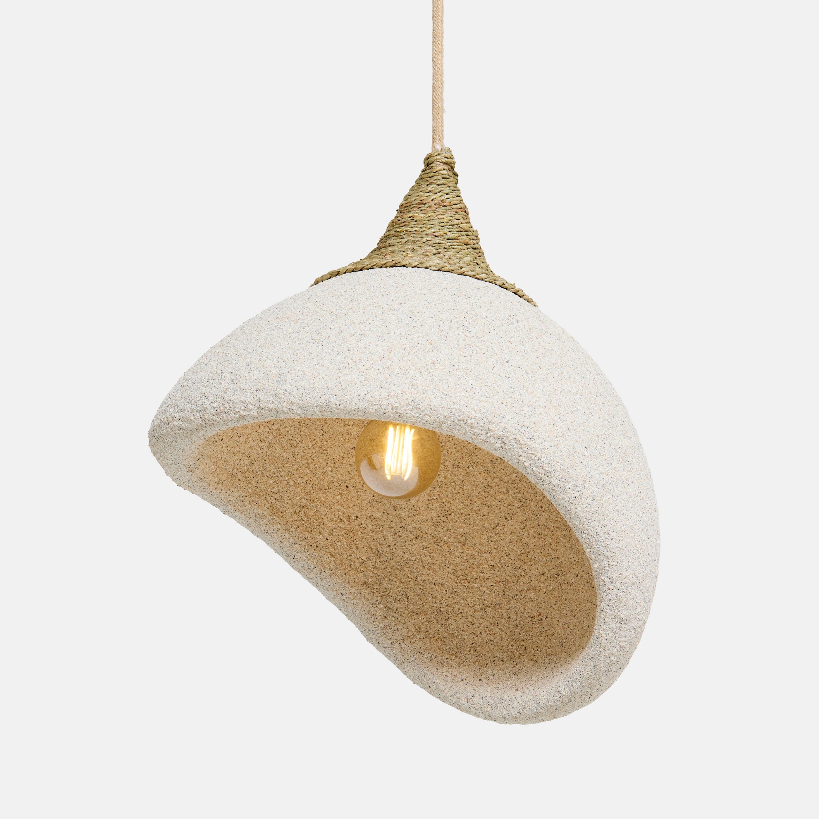 La suspension Miring sable semble flotter dans l’air comme une forme née de la matière elle-même. Sa silhouette douce et asymétrique évoque une pierre polie par le temps, suspendue entre ciel et terre, prête à diffuser une lumière chaude et enveloppante. On perçoit immédiatement ce lien subtil avec la nature, cette impression d’objet façonné par les éléments plus que par la main.