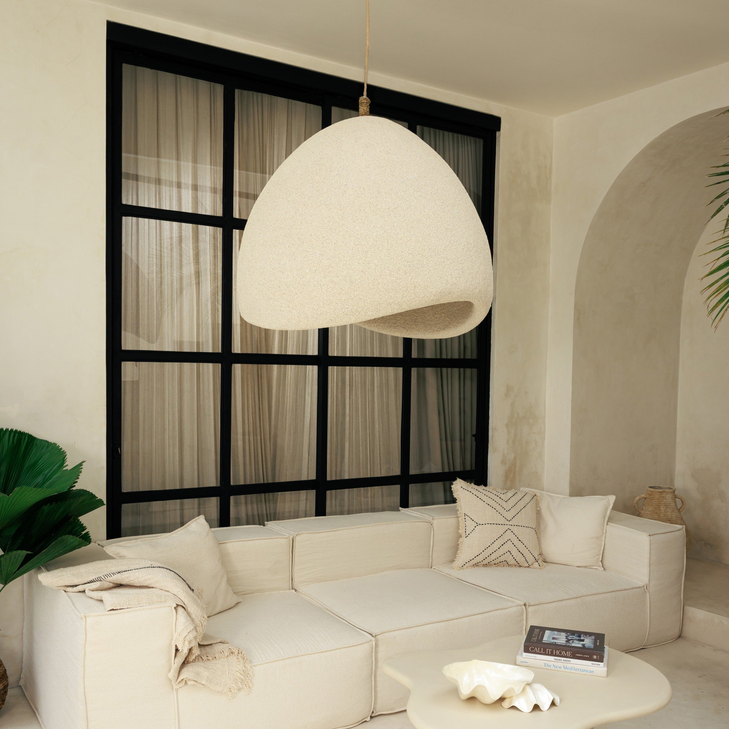 Dans une pièce aux lignes épurées, la suspension Suna en résine avec projection de sable diffuse un éclairage doux et tamisé. Sa texture minérale et sa forme organique installent une ambiance calme, naturelle et contemporaine dans le salon, la chambre ou un coin lecture.