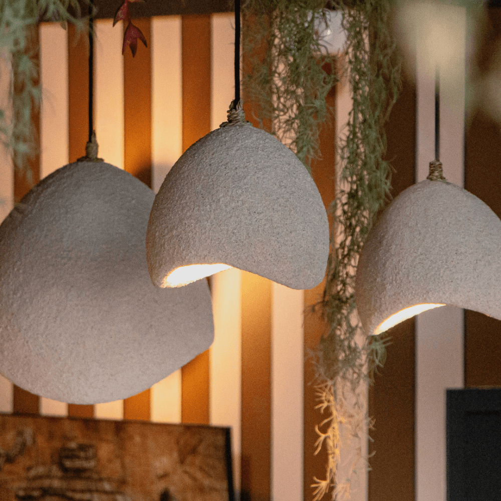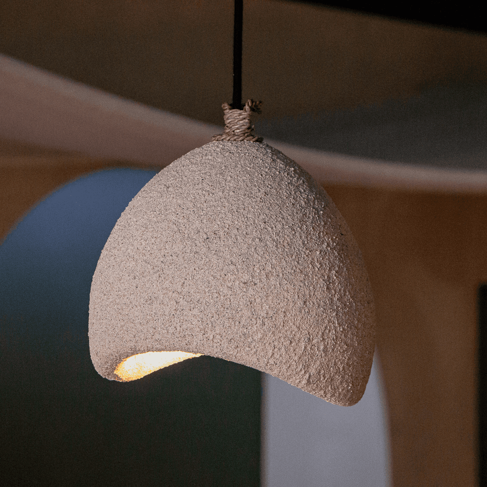 Installée au-dessus d’une table, dans une chambre ou près d’un coin lecture, la suspension Suna compose un éclairage feutré qui adoucit immédiatement l’atmosphère. Façonnée à la main à Bali, elle associe la résine à une projection de sable qui lui donne un fini texturé, presque minéral, très agréable dans un intérieur contemporain, minimaliste ou d’inspiration wabi-sabi. Sa ligne organique évite toute rigidité visuelle et apporte un dessin souple, équilibré, qui trouve facilement sa place dans différents espaces de la maison. Allumée, elle diffuse une clarté douce, sans effet brutal, et met en valeur la matière autant que le volume. Éteinte, elle reste un bel élément décoratif grâce à sa surface subtilement irrégulière et à son allure simple. Dans un salon, au-dessus d’une table de repas ou dans un espace de travail soigné, cette suspension artisanale introduit un accent naturel et texturé, avec ce mélange de retenue et de caractère qui signe les pièces choisies par Design Trip.