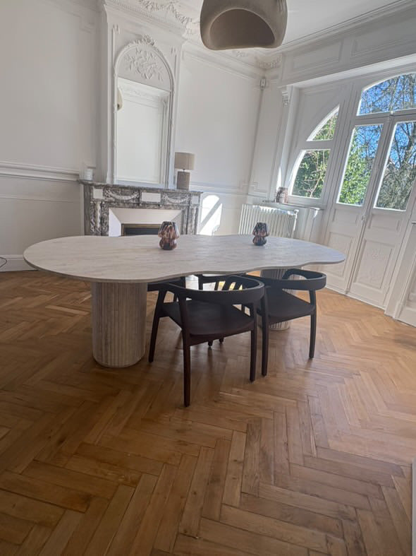 Table à manger en travertin avec pieds striés. Élégante et durable, parfaite pour sublimer votre intérieur ou extérieur avec style et raffinement.