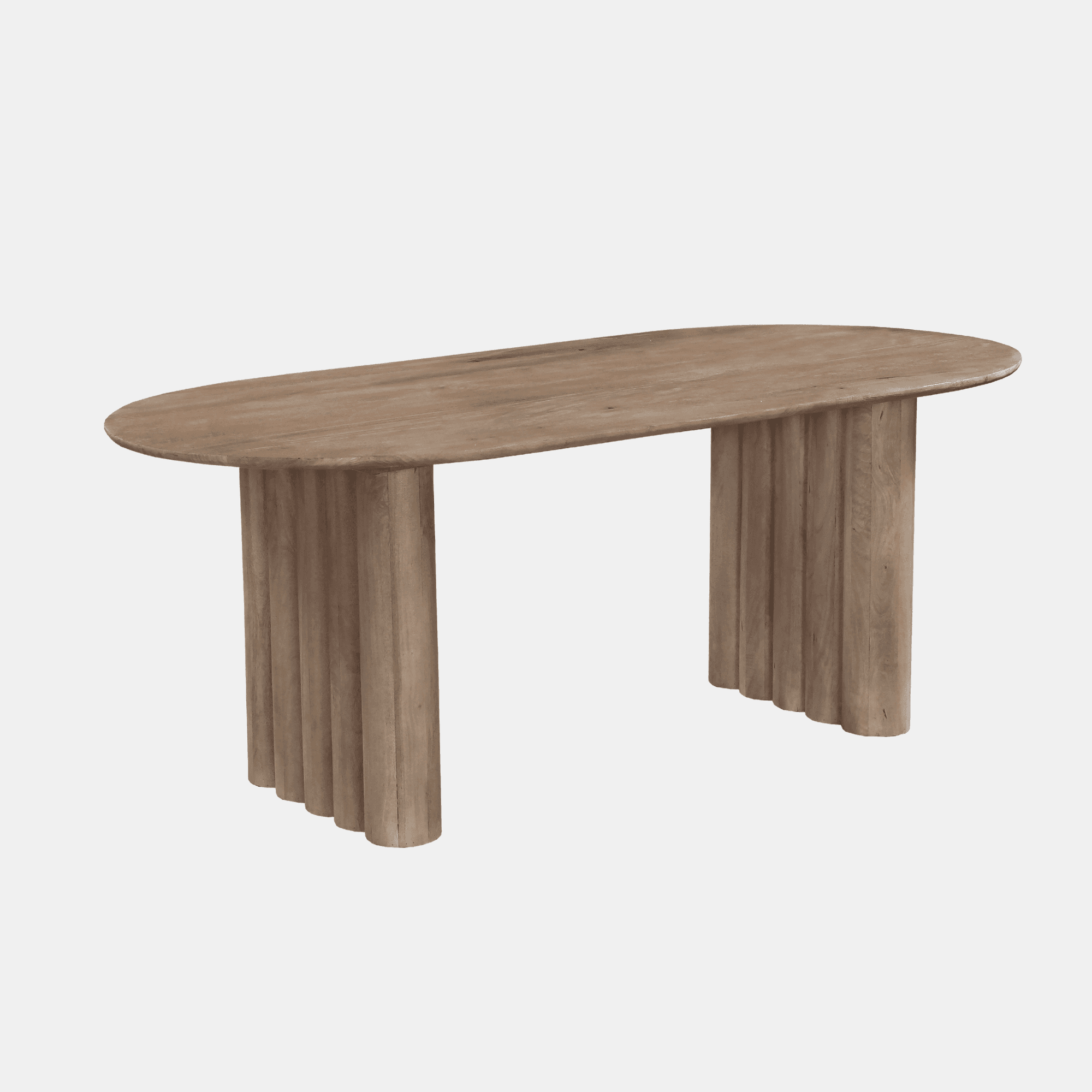 La table Jala naturelle en bois de manguier massif, finition marron clair, accueille 8 à 10 convives dans la salle à manger. Son plateau ovale aux lignes fluides et sa surface protégée anti-taches composent un ensemble soigné, entre allure organique et usage quotidien.