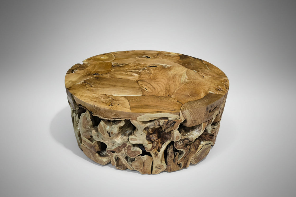 Entre nature et design, cette table basse en teck recyclé célèbre la beauté du bois dans sa forme la plus authentique. Sculptée à partir de fragments assemblés à la main, elle révèle un jeu fascinant de textures et de teintes, où chaque pièce compose une mosaïque naturelle. Ses contours doux et organiques contrastent avec la densité du teck. Le bois, patiné par le temps, dévoile ses nuances dorées et ses veinures sinueuses qui captent la lumière avec élégance. Chaque table est unique, reflet d’un travail artisanal où la matière s’exprime librement. Avec son plateau généreux et sa structure sculpturale, elle devient une pièce maîtresse du salon. Seule ou accompagnée d’autres matières naturelles, elle ancre l’espace dans une atmosphère chaleureuse et contemporaine. Une création où le design se mêle à la nature, et où chaque imperfection devient beauté.