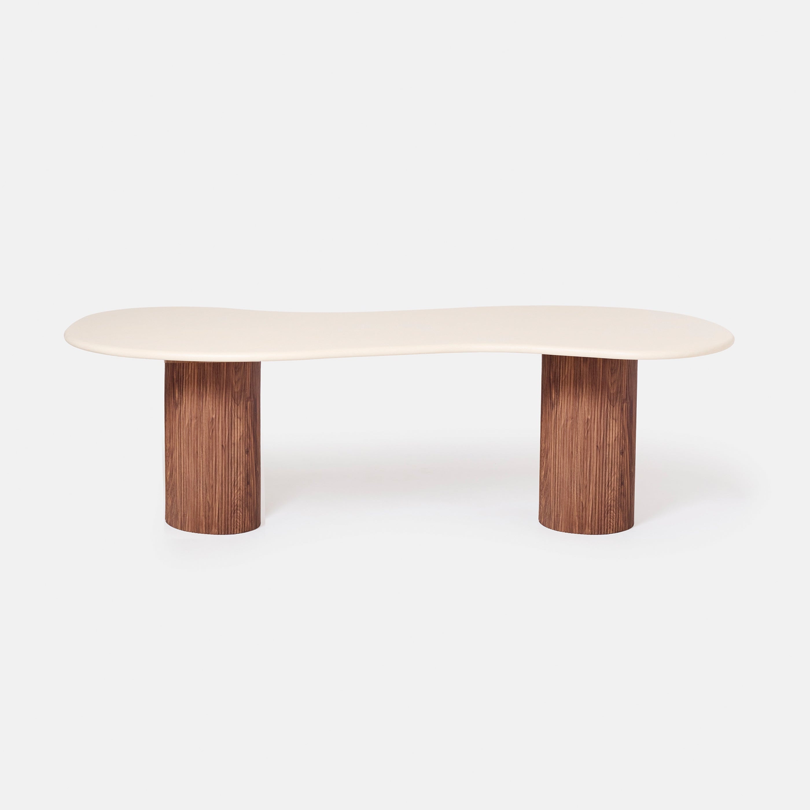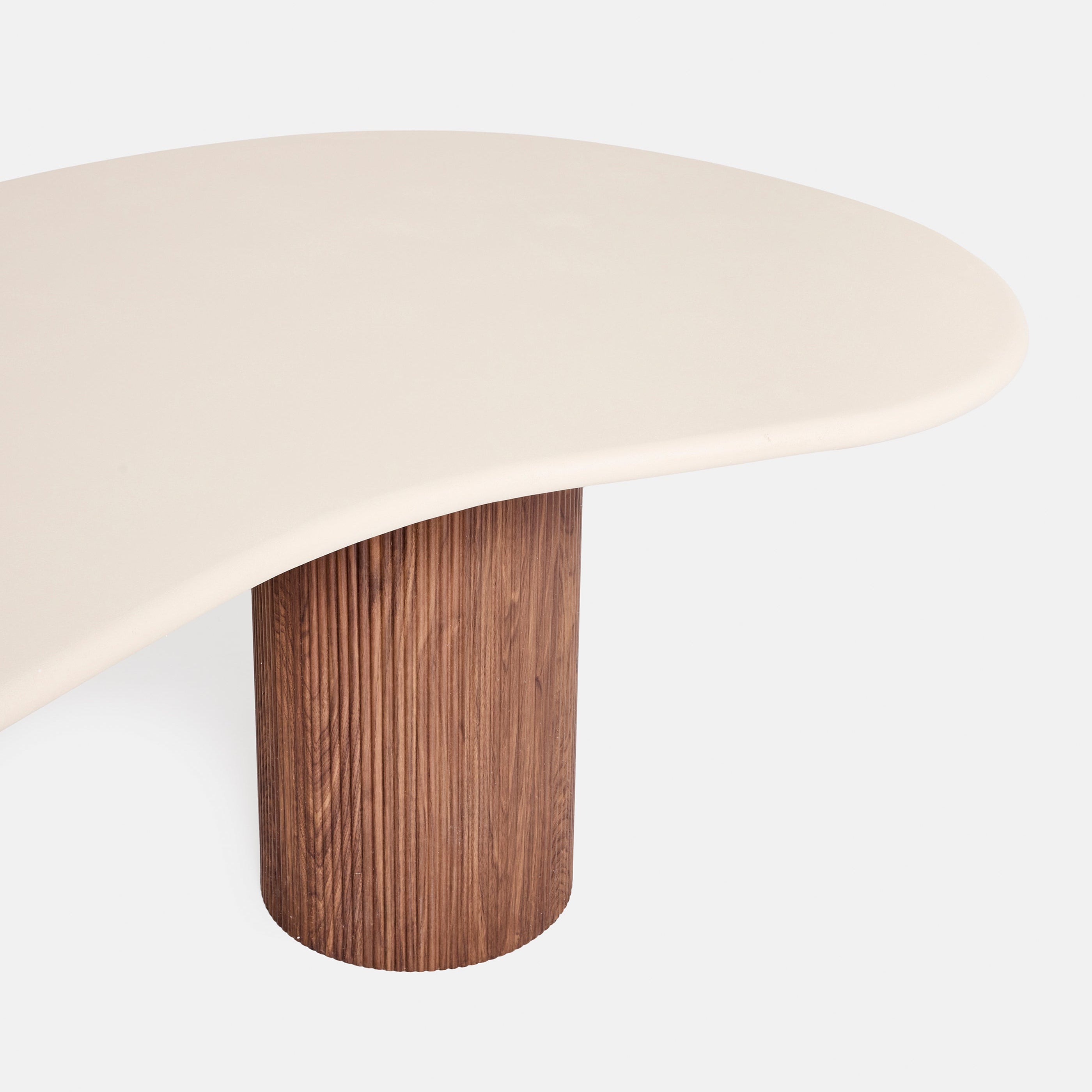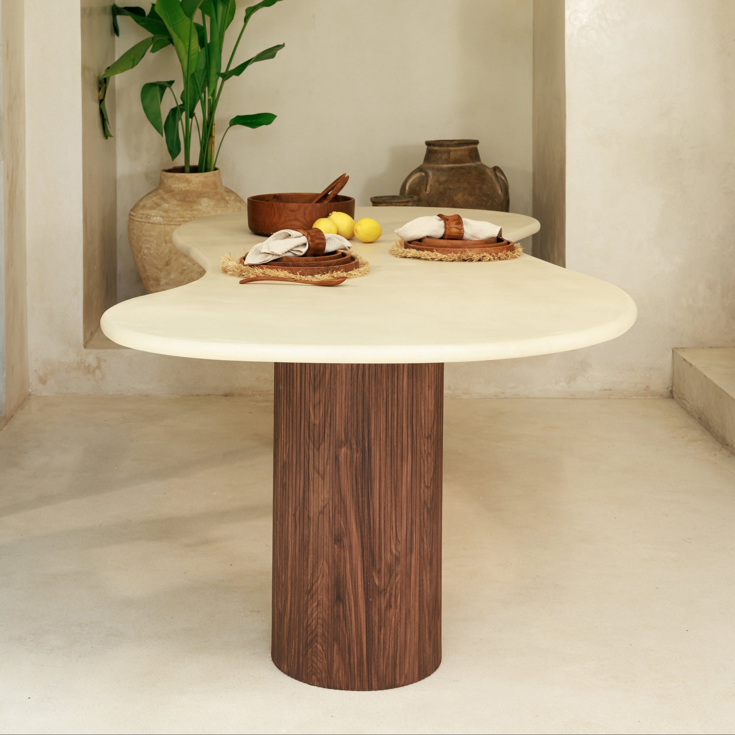 Table à manger organique en béton avec pieds cylindriques en placage noyer strié, design contemporain haut de gamme inspiré du style japandi et wabi sabi. Table de salle à manger en béton et bois, pièce sculpturale idéale pour intérieur moderne, minimaliste ou bohème chic. Mobilier design en béton clair et bois noyer texturé, fabrication artisanale, grande table design pour salle à manger élégante et chaleureuse.