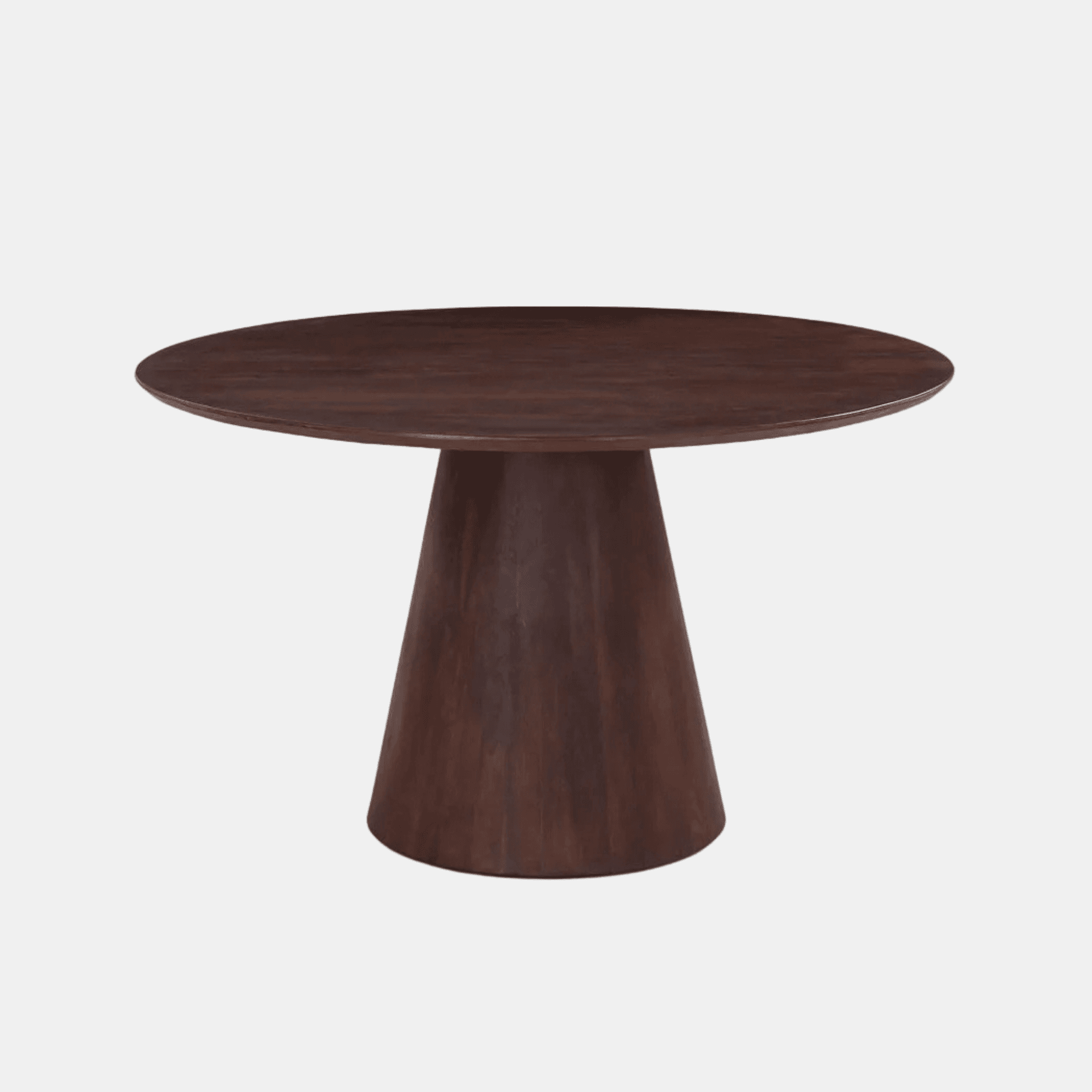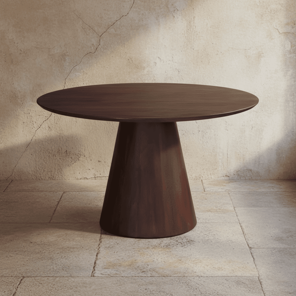 La table à manger Ganga en bois de manguier massif structure la salle à manger avec son plateau rond, sa finition marron profonde et son pied conique sculptural. Une pièce artisanale qui trouve sa place dans un décor contemporain, bohème ou chaleureux.