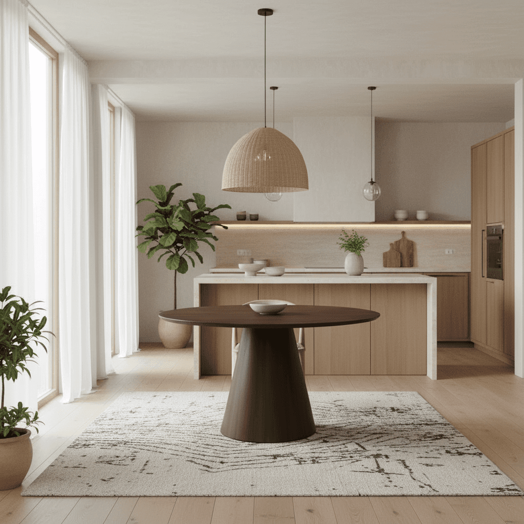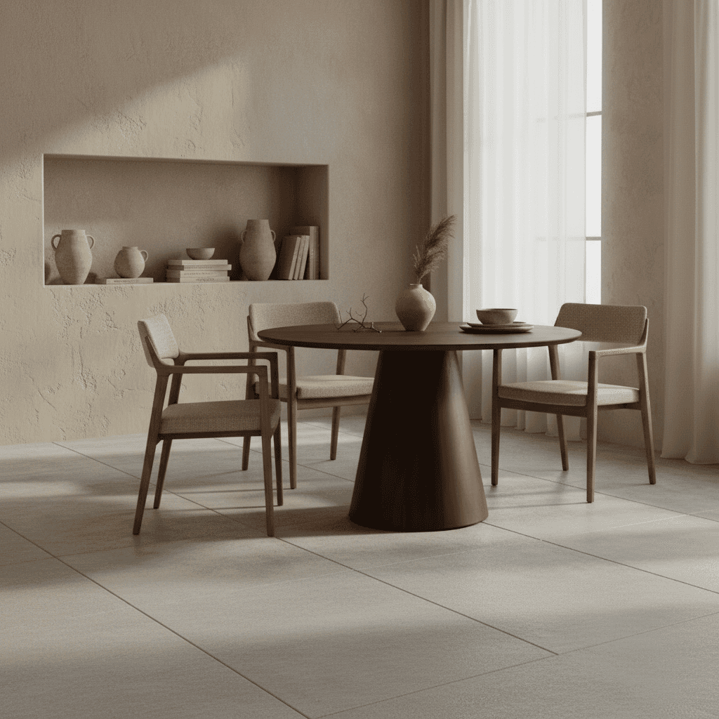 Au centre d’une salle à manger, la table ronde Ganga compose un point d’ancrage aussi fluide que graphique. Son plateau circulaire repose sur un pied conique sculptural qui allège la ligne tout en affirmant le dessin de l’ensemble. Réalisée en bois de manguier massif, elle se distingue par une teinte marron profonde et par les variations naturelles de sa matière, qui donnent à chaque pièce un aspect singulier. La forme ronde favorise une disposition conviviale et une circulation plus douce autour de la table, tandis que son volume équilibré s’intègre aussi bien dans un intérieur contemporain que dans une ambiance plus bohème ou chaleureuse. Fabriquée artisanalement en Inde, Ganga conserve ces irrégularités discrètes qui font le caractère des pièces façonnées avec soin. Utilisée comme table à manger ou comme pièce centrale de la salle à manger, elle associe la densité visuelle du bois massif à une ligne simple, lisible et durable.