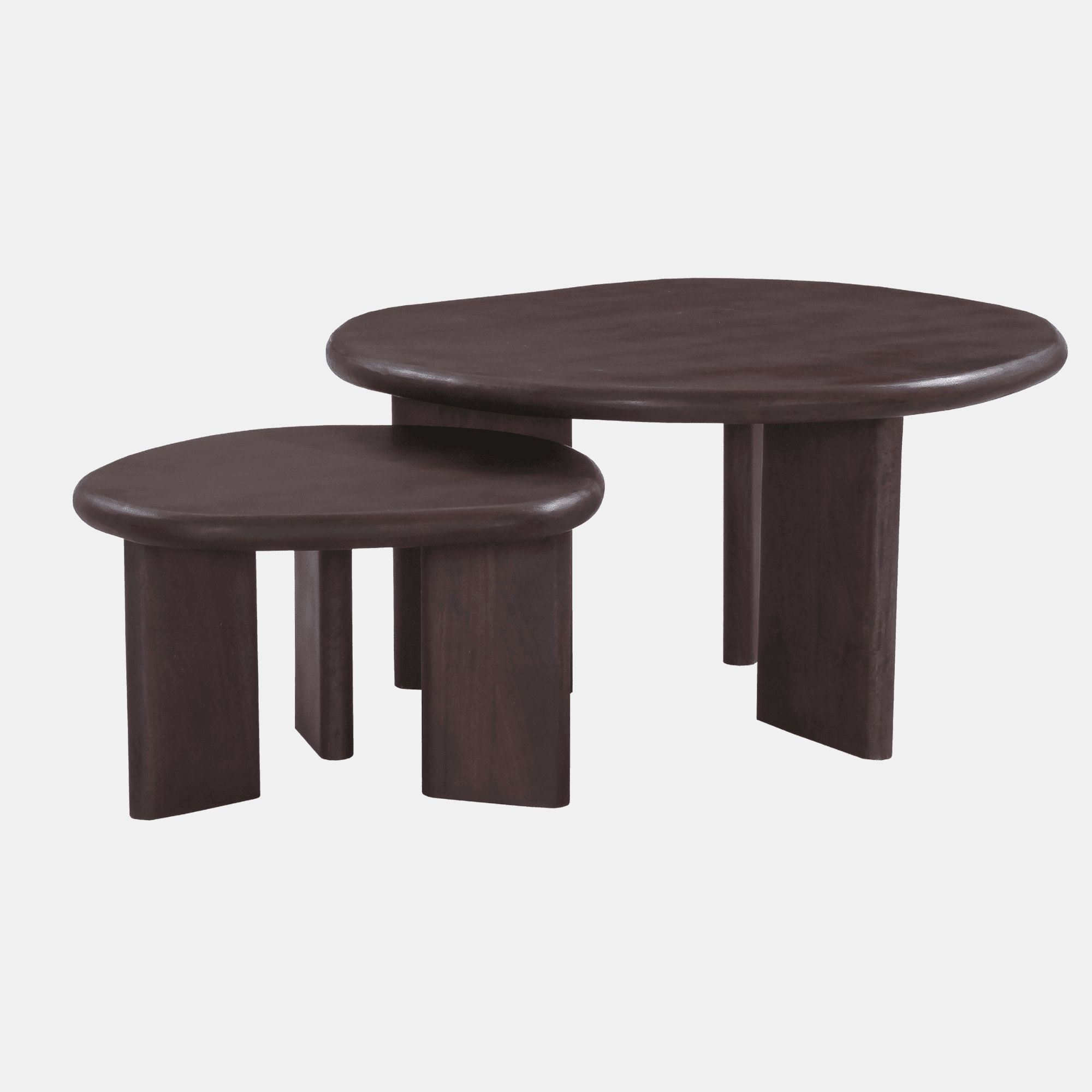 Les tables basses gigognes Asha en bois de manguier massif et finition marron foncé structurent le salon avec un dessin sculptural et une vraie souplesse d'usage. À utiliser ensemble pour composer un ensemble cohérent, ou séparément comme tables d'appoint.