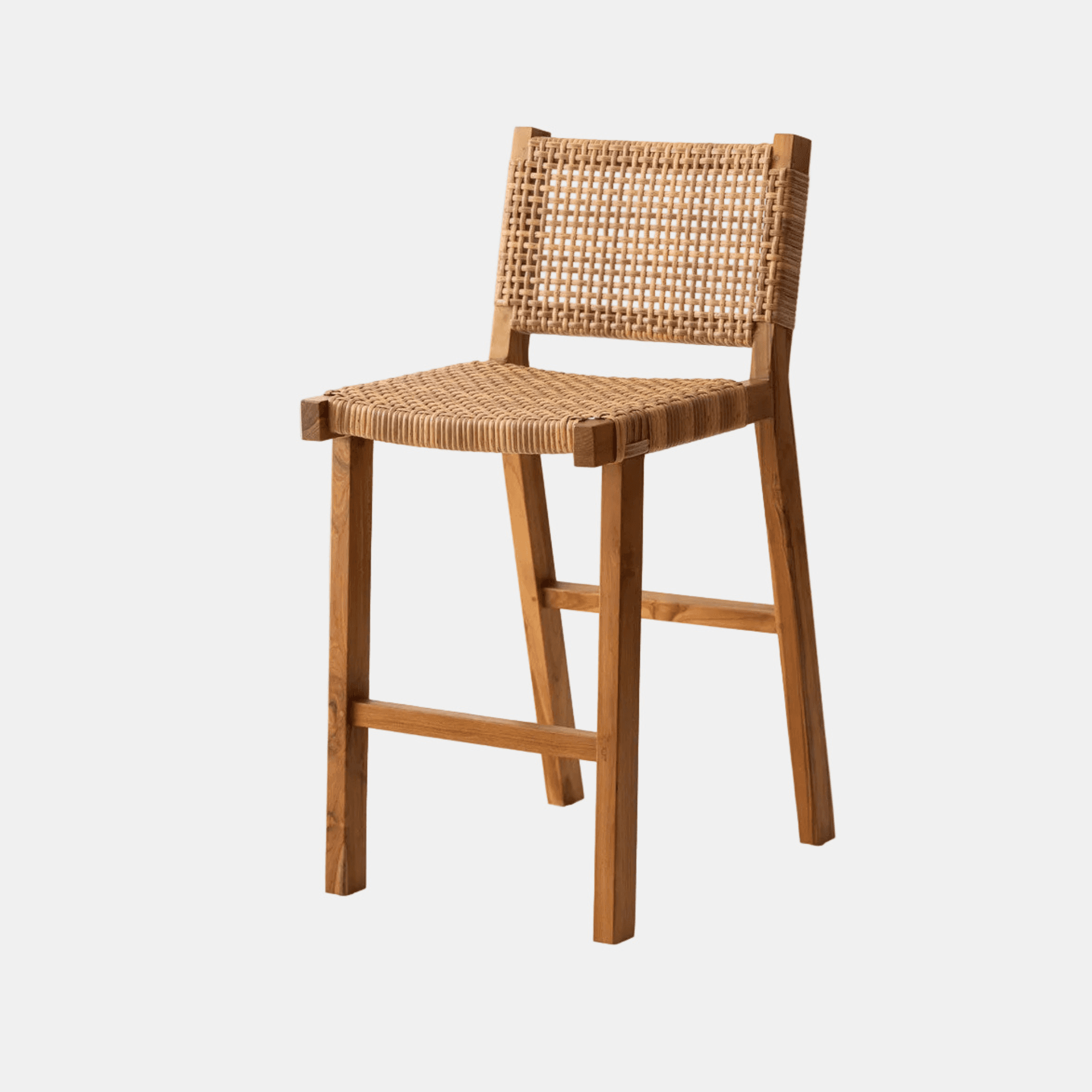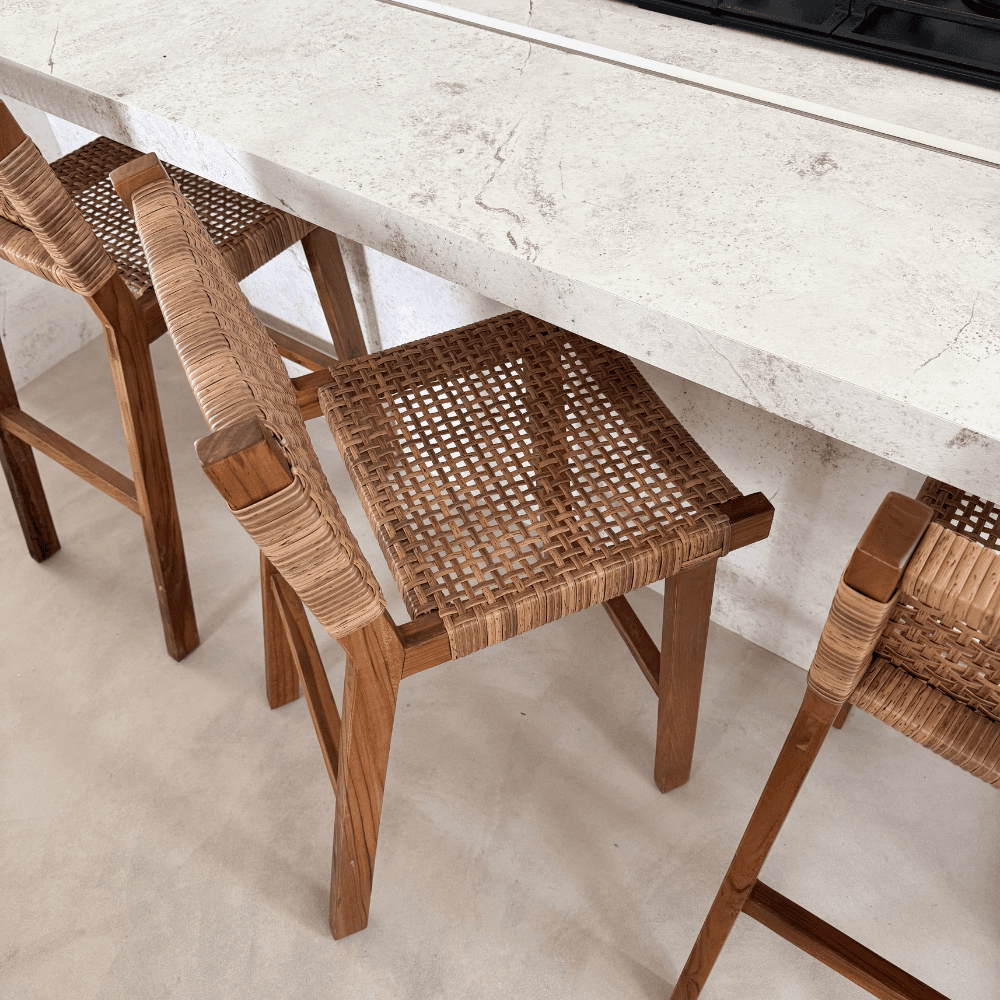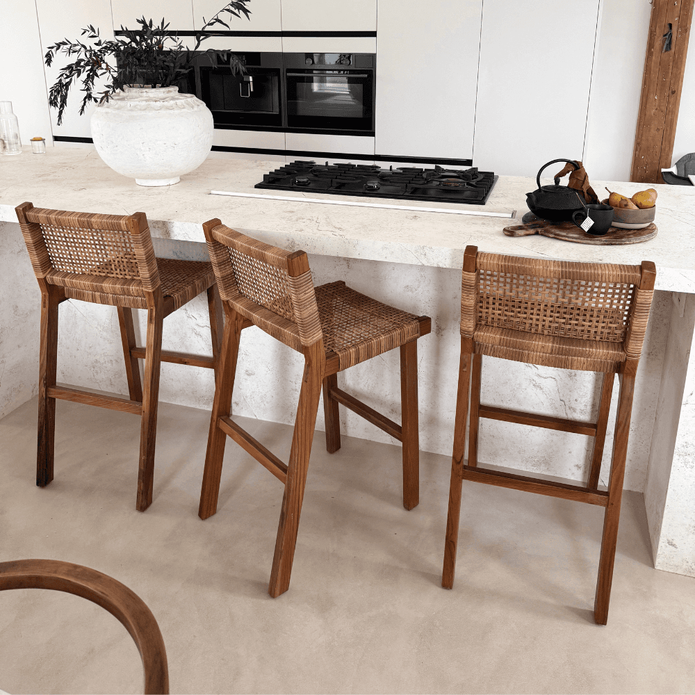 Le tabouret de bar Joko en teck massif de classe A et fibres synthétiques tressées accompagne un îlot central, un comptoir ou une cuisine ouverte avec une ligne nette et un dossier enveloppant. Sa finition naturelle trouve sa place dans un intérieur contemporain, bohème chic ou wabi sabi.