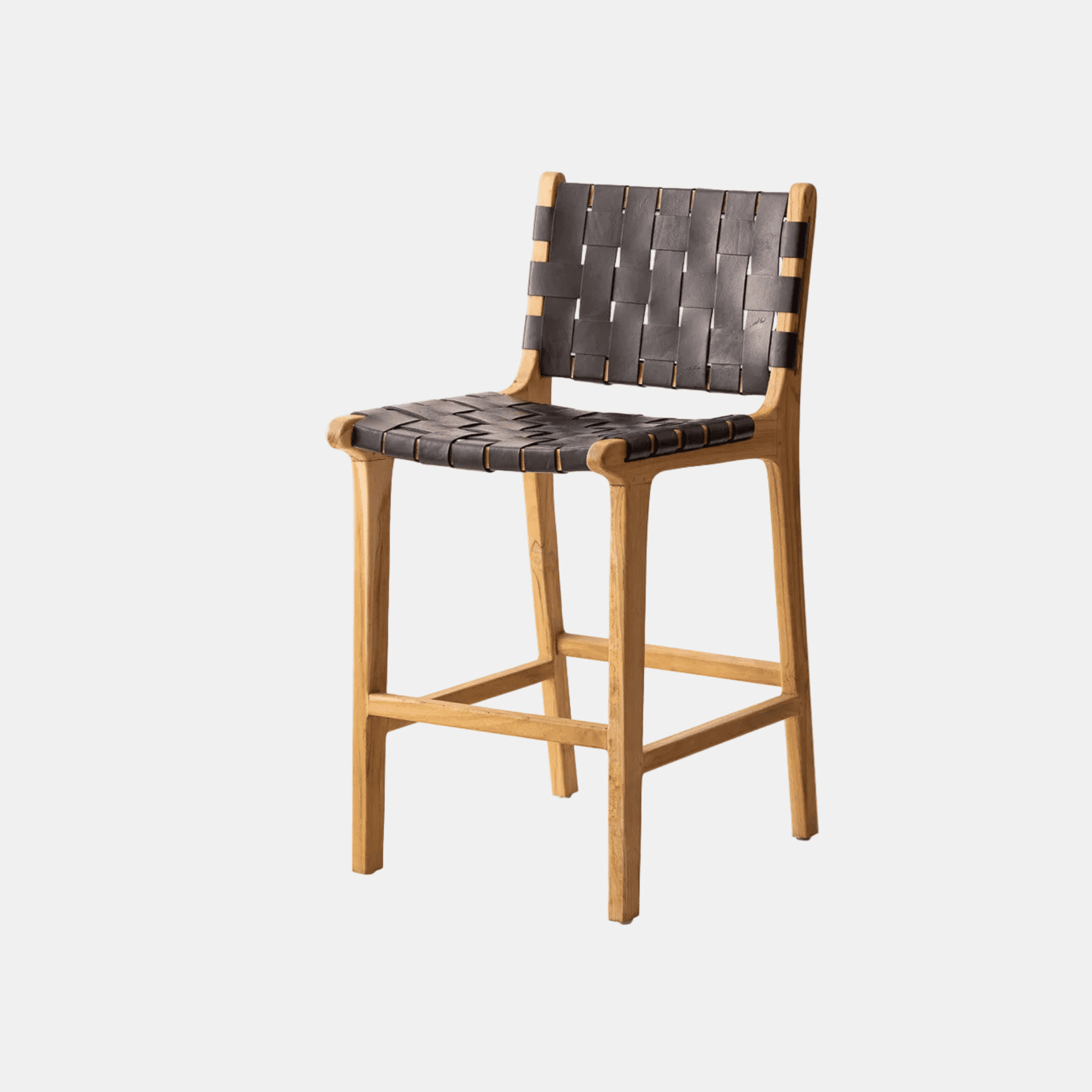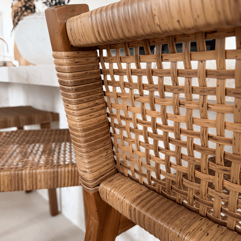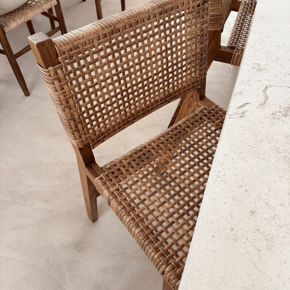 Le tabouret de bar Joko en teck massif de classe A et fibres synthétiques tressées accompagne un îlot central, un comptoir ou une cuisine ouverte avec une ligne nette et un dossier enveloppant. Sa finition naturelle trouve sa place dans un intérieur contemporain, bohème chic ou wabi sabi.