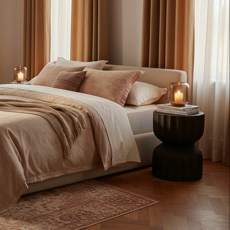 Tabouret sculptural en bois massif de manguier finition noire brûlée, Dhara séduit par sa forme sablier striée et son caractère artisanal, idéal comme table d’appoint, bout de canapé ou chevet dans un intérieur contemporain, bohème chic ou wabi-sabi.