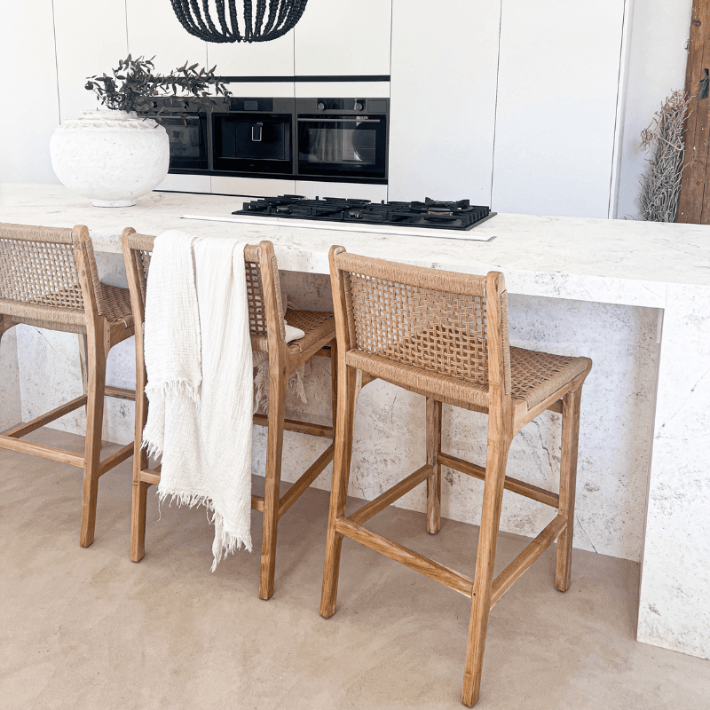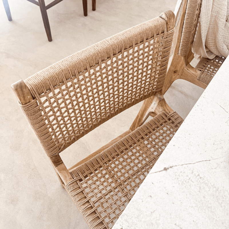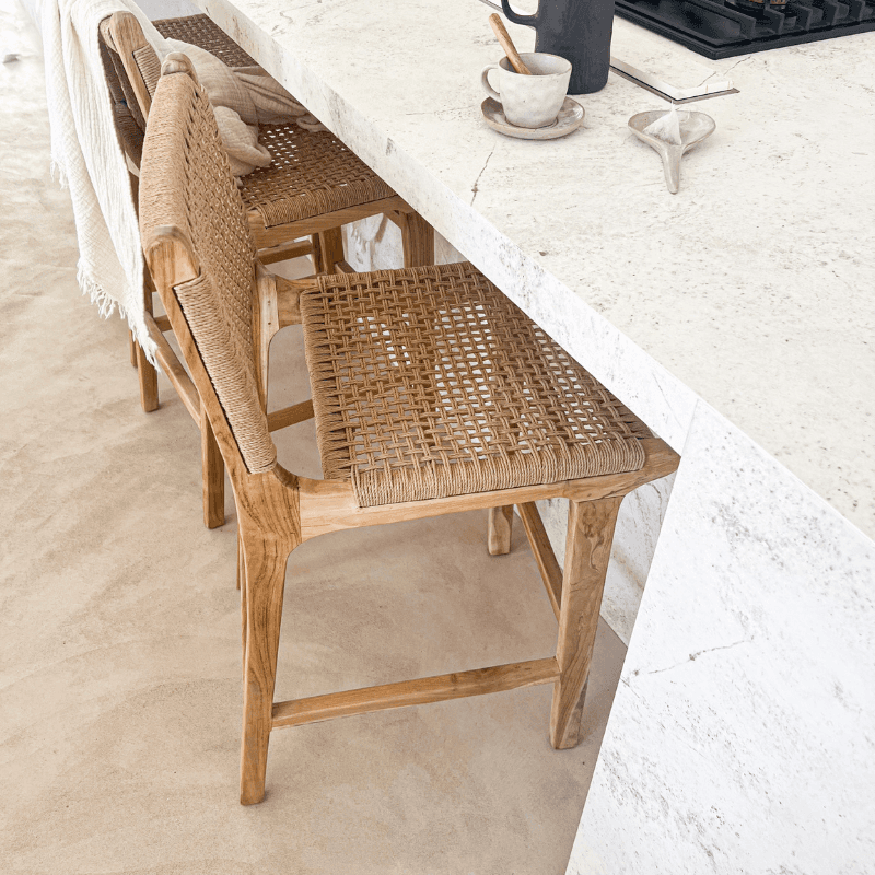 Autour d'un comptoir ou d'un îlot, le tabouret de bar Punta compose une assise claire au dessin équilibré. Sa structure en teck massif de classe A, travaillée dans une finition blanchie patinée, met en valeur la sobriété de ses lignes et l'aspect naturellement nuancé du bois. L'assise en corde tressée à la main apporte un contraste de texture qui allège l'ensemble tout en renforçant son caractère artisanal. Rien de démonstratif ici, mais une pièce bien tenue, pensée pour s'intégrer aussi facilement dans une cuisine ouverte que dans un espace bar. Le dossier prolonge la ligne du piètement avec finesse et donne au modèle une allure élancée, sans alourdir sa lecture visuelle. Dans un décor bohème chic, wabi sabi ou plus contemporain, Punta trouve naturellement sa place grâce à l'équilibre entre matière brute, finition douce et usage quotidien. Ce tabouret de comptoir associe ainsi la noblesse du teck et la simplicité d'un tressage en fibres naturelles dans une écriture sobre, décorative et fonctionnelle.