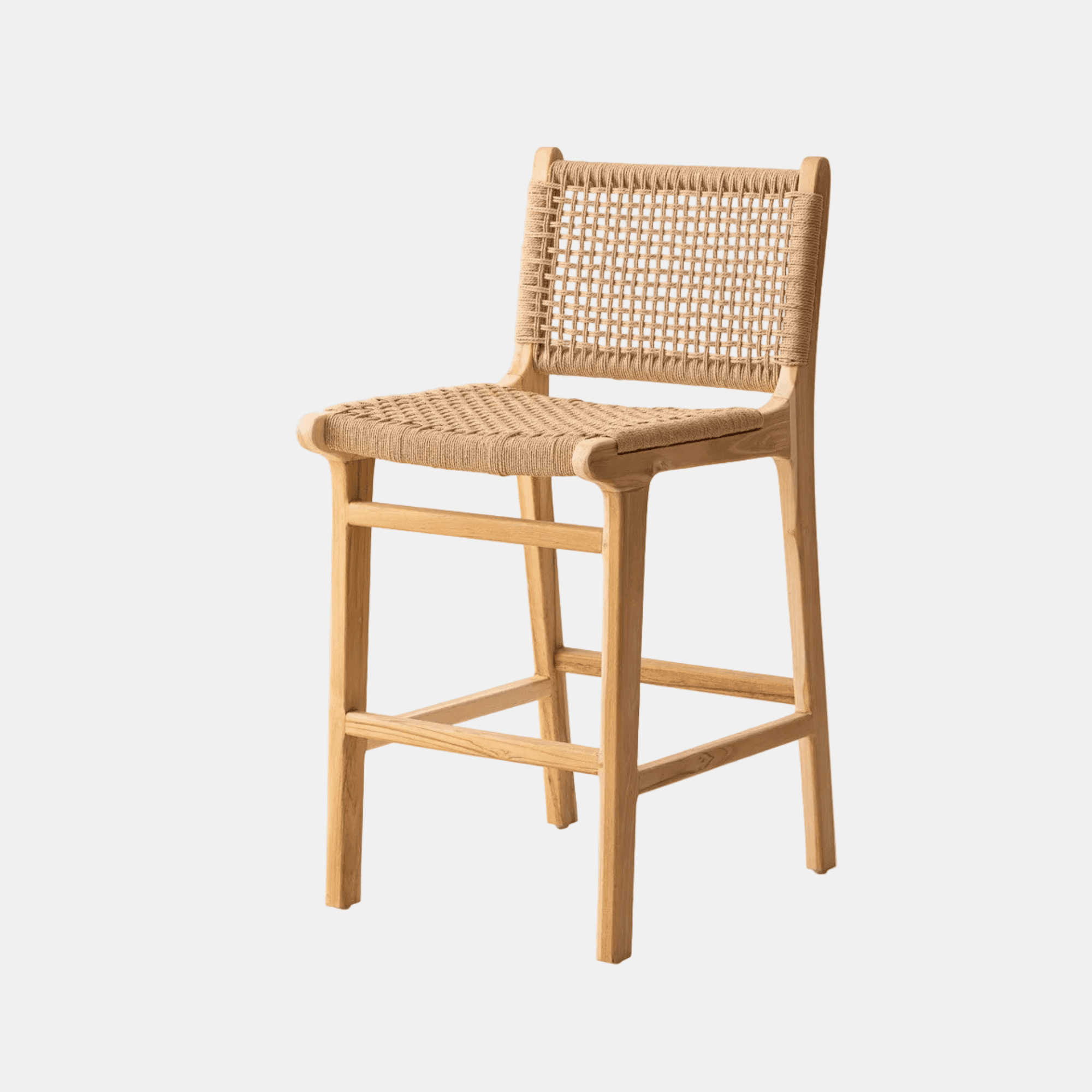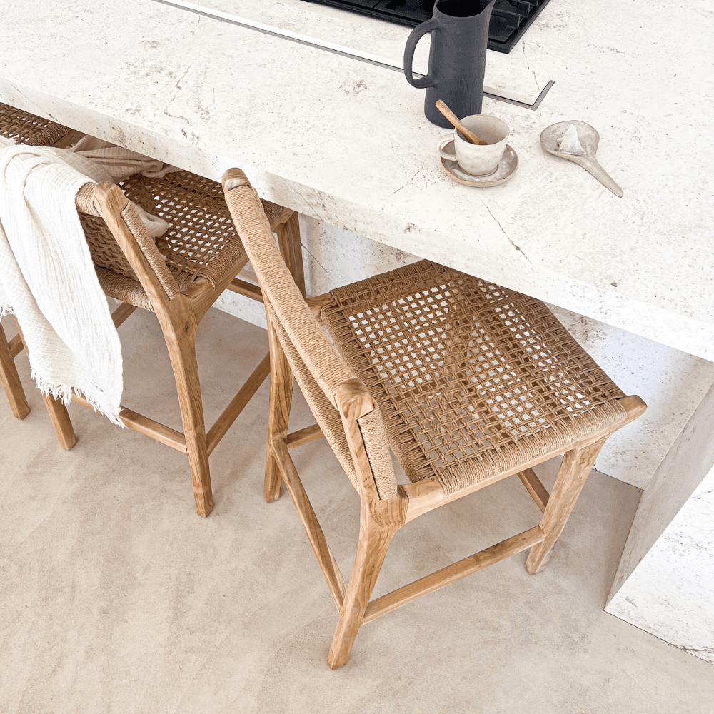 En teck blanchi et corde en fibres naturelles, le tabouret de bar Punta apporte une ligne artisanale et légère à un comptoir ou un îlot de cuisine. Son assise tressée à la main et sa finition patinée s'intègrent avec justesse dans un intérieur bohème chic, wabi sabi ou contemporain.