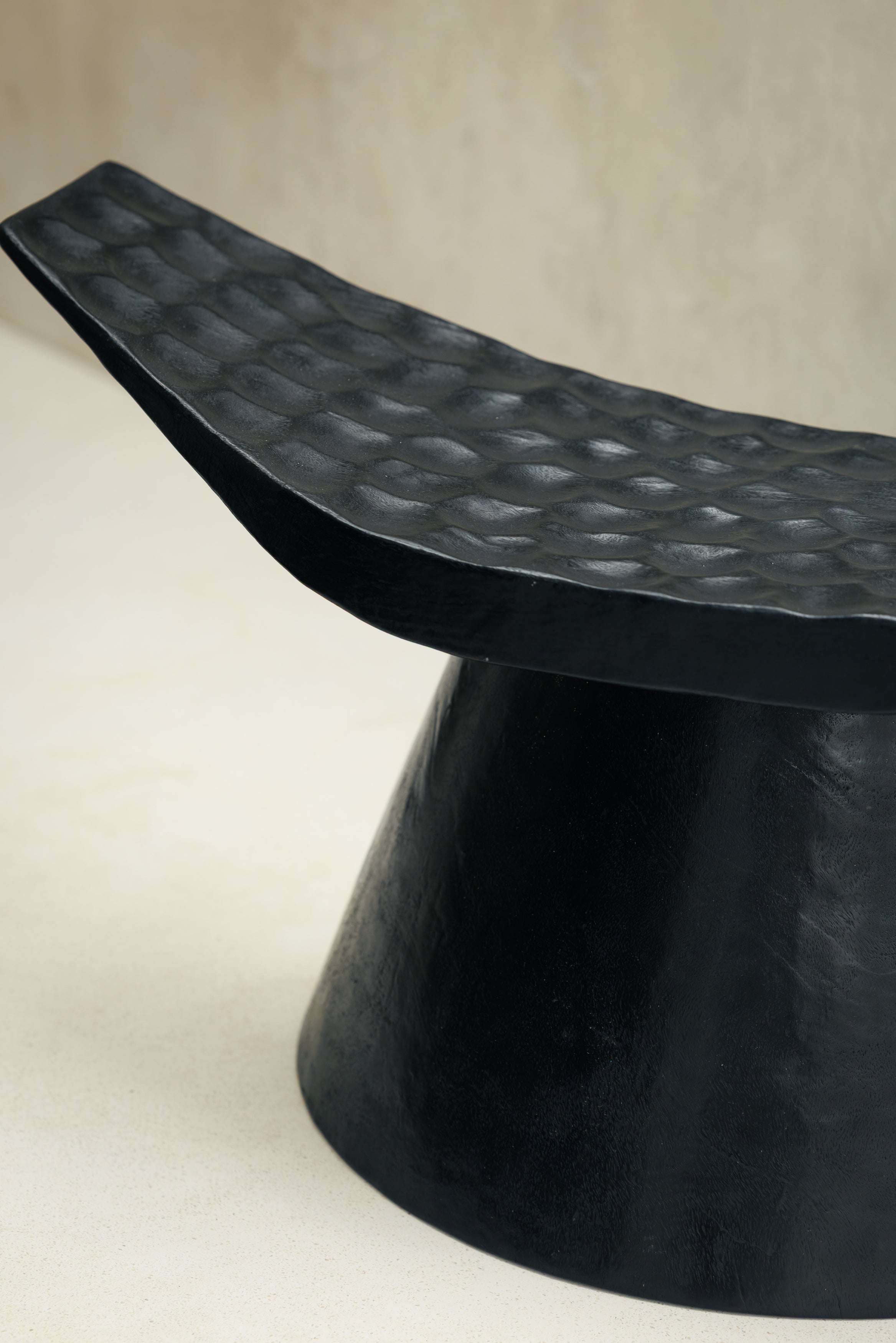 Tabouret Mango en bois de manguier massif martelé noir, pièce artisanale sculpturale au style wabi-sabi et contemporain, idéale en siège d’appoint, table d’appoint ou banc décoratif pour sublimer un salon, une chambre ou une entrée avec une touche naturelle, brute et élégante.