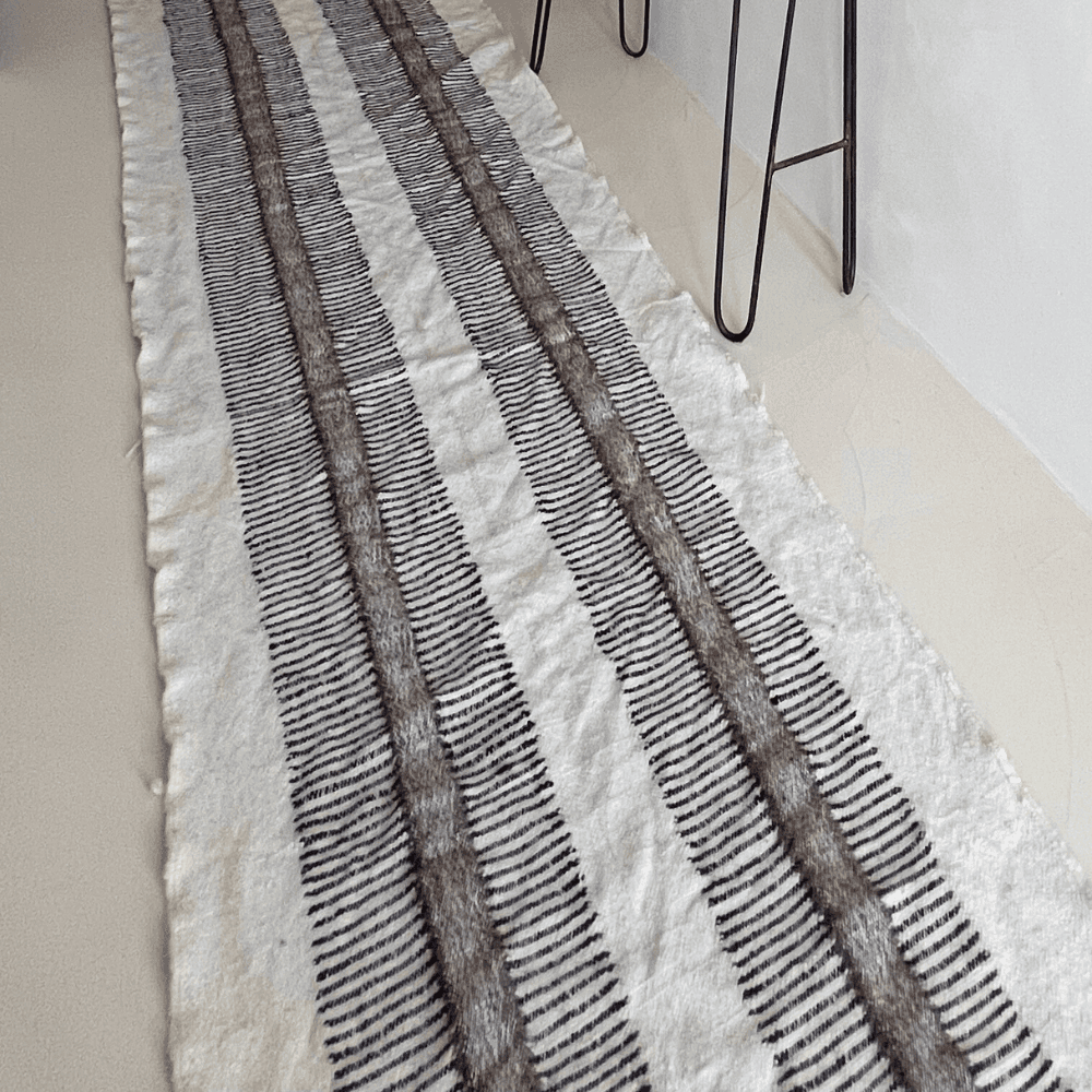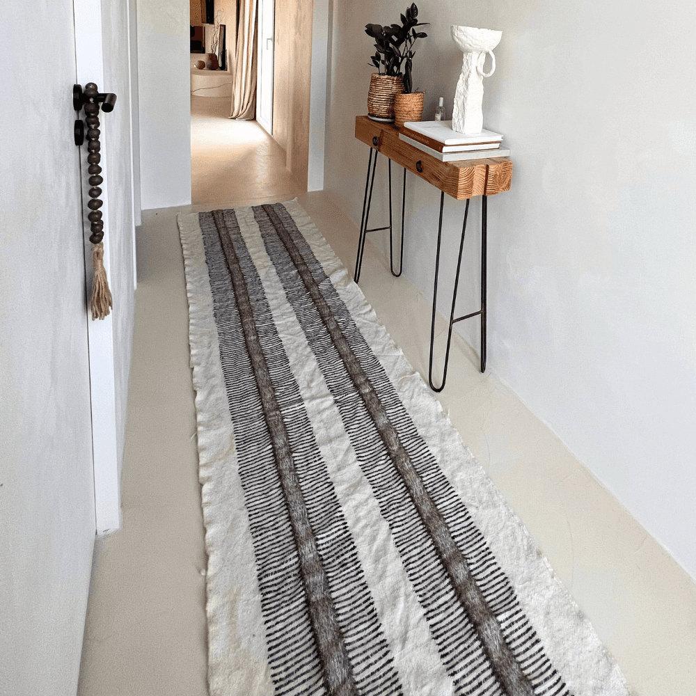 Dans une entrée, le long d’un couloir ou au pied d’un mur, ce tapis en kilim dessine un passage net et apporte une assise visuelle discrète à l’espace. Son tissage artisanal en laine, réalisé à la main au Maroc, met en avant un savoir-faire traditionnel et une finition naturelle qui s’intègre facilement dans des décors sobres. Les nuances restent mesurées, ce qui permet au tapis d’accompagner aussi bien un intérieur minimaliste qu’une composition plus bohème chic. Sa texture tissée convient particulièrement aux zones de passage, où la laine robuste trouve pleinement sa place sans alourdir l’ensemble. On apprécie aussi la manière dont son format allongé accompagne la circulation et souligne l’architecture intérieure avec simplicité. Inspiré par les codes japandi et wabi-sabi, il compose un décor apaisé, attentif aux matières et au travail de la main. Chaque pièce étant réalisée artisanalement, les motifs et les nuances peuvent varier, ce qui donne à chaque tapis un caractère propre sans rompre l’équilibre de l’ensemble.