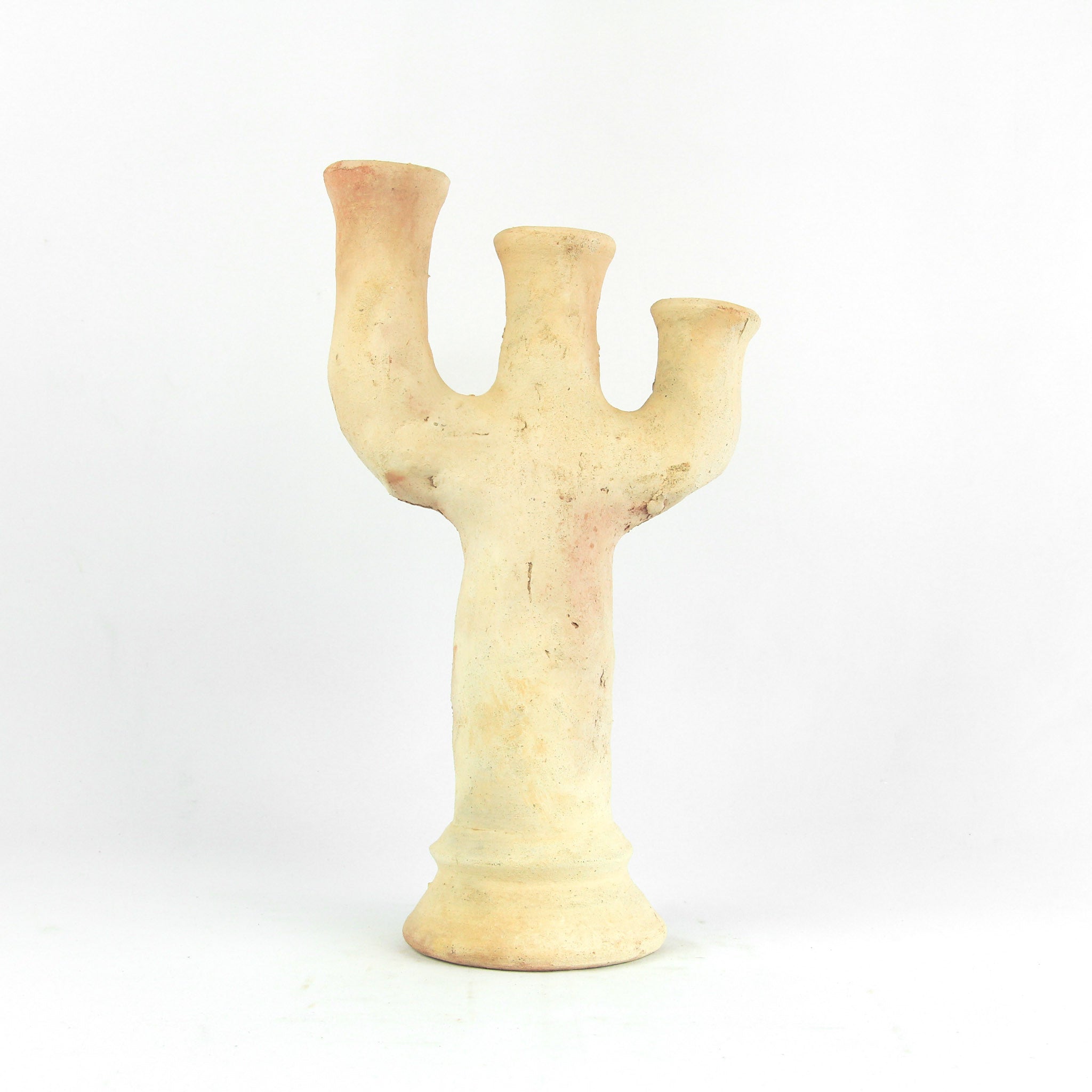 Découvrez le Vase Thurya, un joyau d'argile de Tamegroute, fusionnant vase et bougeoir en trois têtes majestueuses. Une pièce d'artisanat marocain sans pareil.
