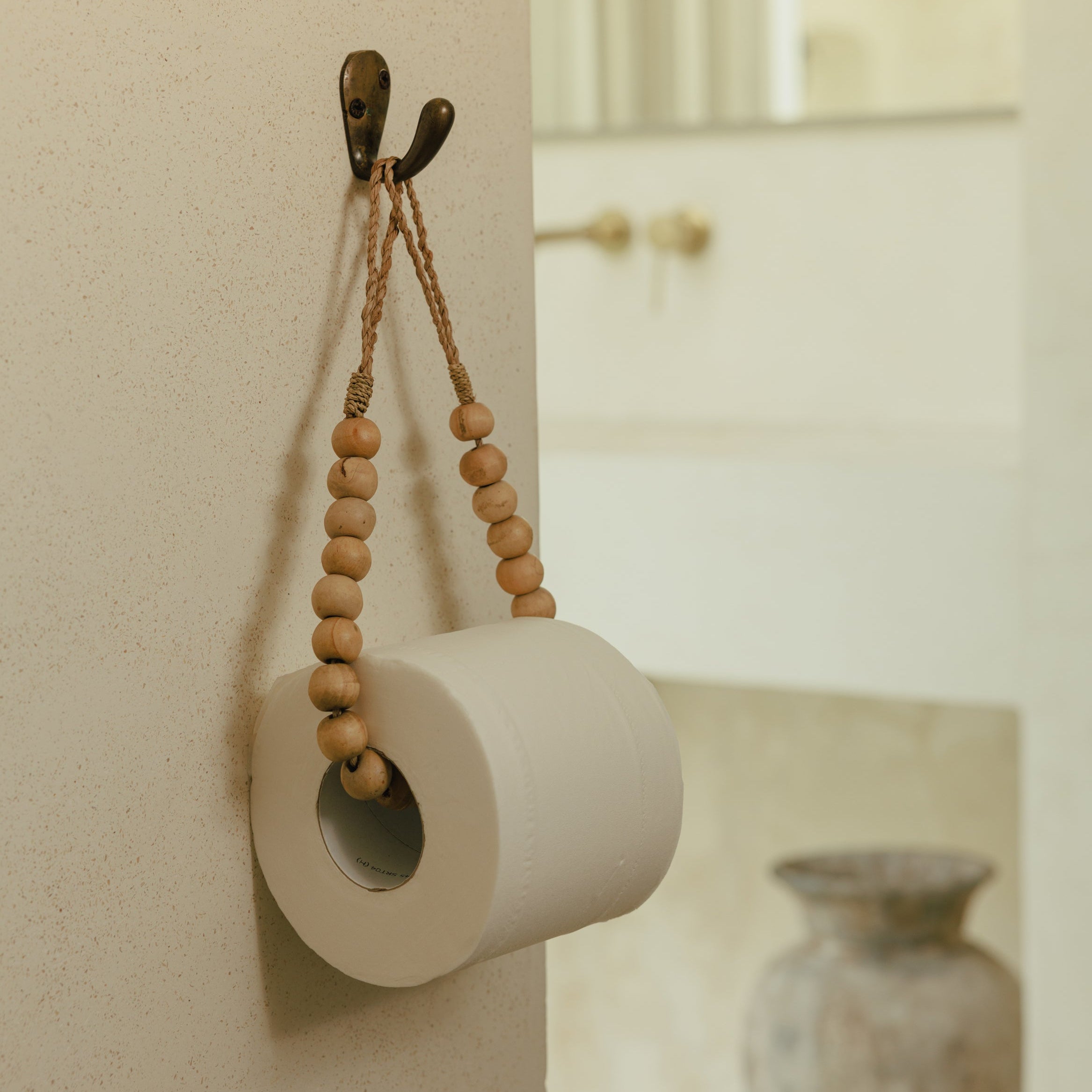 Ajouter une touche d’ailleurs dans la salle de bain, c’est offrir au quotidien un souffle d’évasion. Ce porte-rouleau en perles de bois interprète un accessoire discret avec naturel et élégance, en laissant parler la matière. Façonné à la main, il révèle la douceur des perles polies, le grain du bois et cette sensation simple, presque instinctive, que procurent les objets artisanaux. Suspendu dans la salle de bain ou les toilettes, il évoque les intérieurs tropicaux, les marchés lointains et l’authenticité des gestes faits avec soin, apportant une note chaleureuse et dépaysante à l’espace.